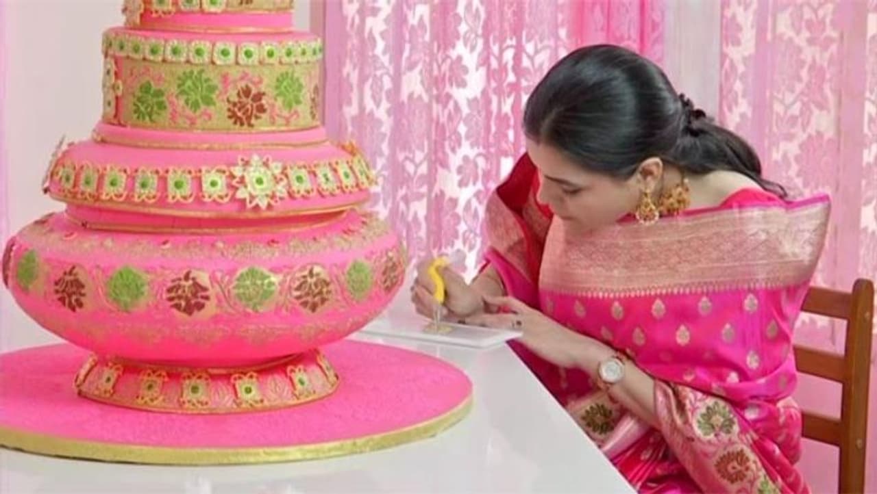 पुणे की रहने वाली प्राची ने इस केक में ठीक उसी तरह जरी, मोती की डिजाइन और एम्ब्रॉयडरी की है जैसी किसी बनारसी साड़ी में की जाती है।