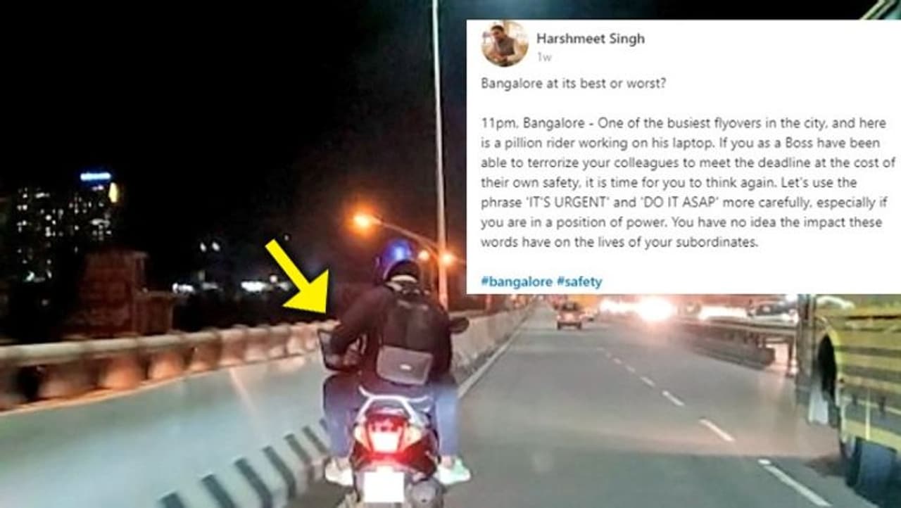 हर्षमीत ने कैप्शन में लिखा, रात 11 बजे, बेंगलुरु शहर के सबसे व्यस्त फ्लाईओवरों में एक। यहां स्कूटी पर पीछे बैठा शख्स राइड के दौरान लैपटॉप पर काम कर रहा है। अगर आप एक बॉस के तौर पर अपने सहयोगियों की सुरक्षा की कीमत पर काम को इस तरह करने का दबाव बनाएंगे तो फिर यह आपके लिए बेहतर होगा कि इस पर गहराई से सोचें। आइए, इट्स अर्जेंट, डू इट एएसएपी (जितनी जल्दी हो सके इसे पूरा करें।) वाक्यों का उपयोग और भी सावधानी से करें। यह आपके लिए फिर से सोचने का समय है। आप नहीं जानते कि इन शब्दों का आपके सहयोगियों या अधीनस्थों पर क्या प्रभाव डालता है।