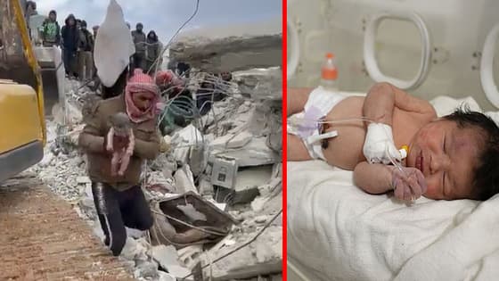 सीरिया में रेस्क्यू ऑपरेशन के दौरान कुछ गांव वालों ने मलबे से एक नवजात बच्चे के रोने की आवाज सुनी। आवाज सुनते ही उस दिशा से मलबा हटाया जाने लगा तभी एक मलबे के नीचे एक महिला दिखी जिसने नवजात बच्चे को जन्म दिया था और बच्चा गर्भनाल से जुड़ा हुआा था।