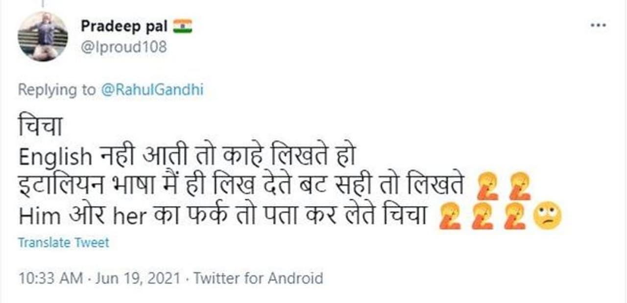 राहुल गांधी के ट्वीट की आखिरी लाइन को लेकर ट्विटर यूजर्स ने ट्रोल करना शुरू कर दिया। ट्रोलर्स ने पूछा- भारत पुल्लिंग है या स्त्रीलिंग? एक ट्रोलर ने कहा कि उन्हें Her की जगह His का उपयोग करना चाहिए था।