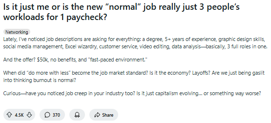 यूजर्स ने अपनी पोस्ट में लिखा, "हाल ही में, मैंने देखा है कि जॉब डिटेल में सब कुछ मांगा जा रहा है, एक शख्स में तीन तरह के काम करने की स्किल देखी जा रही है। क्या भविष्य में अब हमें मल्टी टास्किंग के लिए तैयार हो जाना चाहिए।