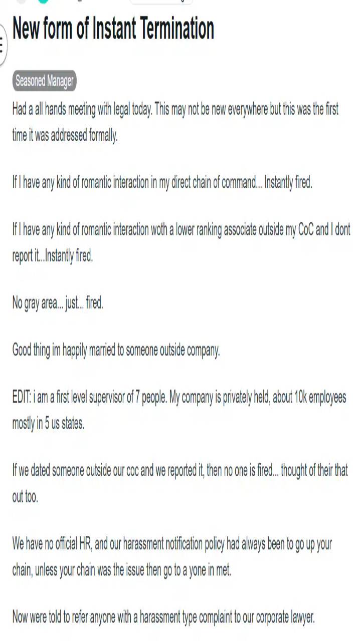 पोस्ट के मुताबिक, कंपनी ने कमांड चेन के अंदर रोमांटिक रिलेशन को लेकर के जीरो-टॉलरेंस पॉलिसी लागू की है। इसके तहत कोई भी कर्मचारी जो सीधे अपने अधीनस्थ ( subordinate ) किसी दूसरे एंप्लाई के साथ रोमांटिक रिलेशन में पाया गया, तो उसे तत्काल कंपना से बर्खास्त कर दिया जाएगा। मैनेजर ने आगे कहा कि अगर इस डिटेल को तत्काल शेयर नहीं किया गया तो इसके लिए जिम्मेदार कमांड चेन के बाहर लोअर लेवल के कर्मचारियोंकी भी बर्खास्तगी हो सकती है।