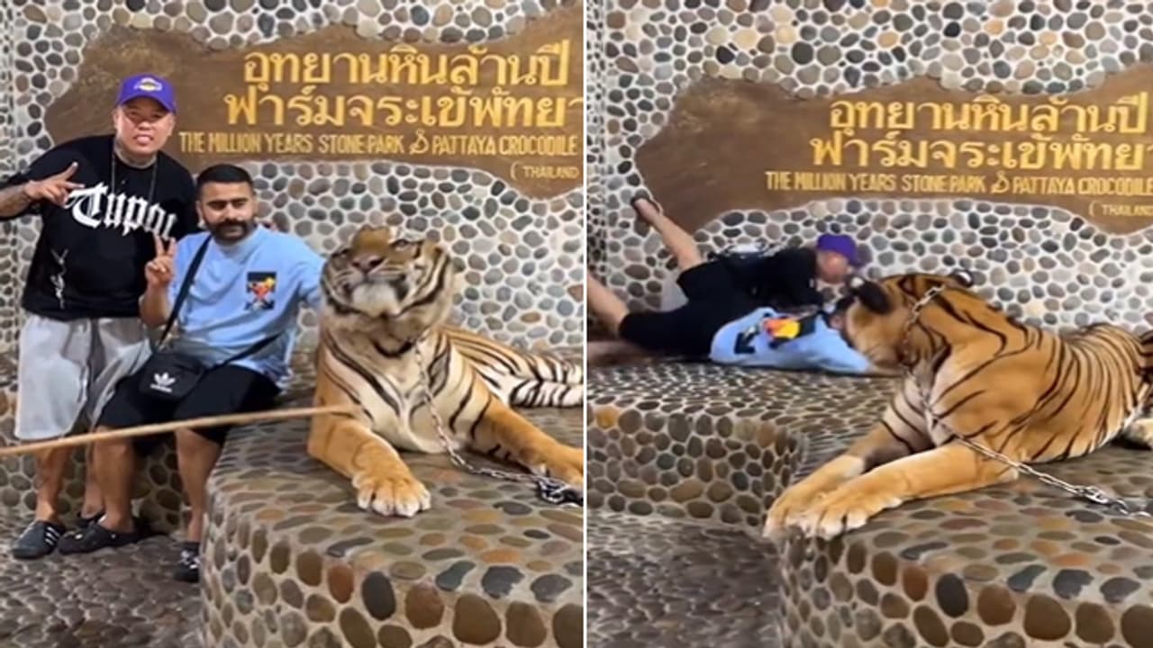 वायरल डेस्क. बाघ का दीदार करने लोग कहां-कहां नहीं जाते। इस बेहद ताकतवर और जंगल पर राज करने वाले जीव से हर कोई खौफ खाता है पर ये जीव तभी तक अच्छा लगता है जब तक ये एक सुरक्षित दूरी पर हो या किसी जू में, वरना ये करीब आ जाए तो अच्छे खासे व्यक्ति की भी हालत पतली हो जाती है। सोशल मीडिया पर एक ऐसा ही वीडियो वायरल हो रहा है, जिसमें जंजीर से बंधे एक बाघ के साथ दो दोस्त फोटो खिंचा रहे होते हैं कि तभी बाघ कुछ ऐसा करता है कि दोनों दोस्तों की चीखें निकल जाती हैं।