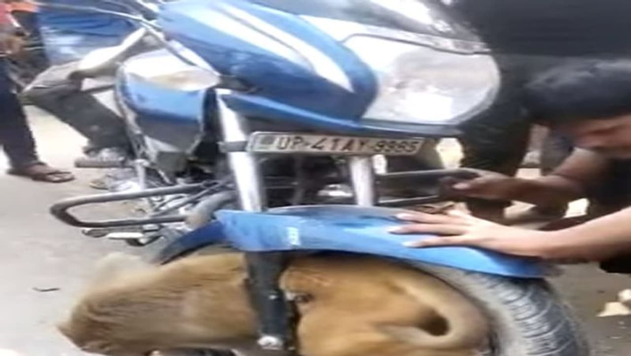 वायरल वीडियो उत्तरप्रदेश के बाराबंकी का बताया जा रहा है। जानकारी के मुताबिक एक तेज रफ्तार टू-व्हीलर सड़क से गुजर रही थी, तभी बंदर भी सड़क पार करने लगा और गाड़ी के पहले पहिए में फंस गया। बाद में पास के एक मैकेनिक को बुलाकर गाड़ी के सामने का पहिया खोला गया, जिससे बंदर आजाद हो सका। बंदर को इस दुर्घटना में चोटें भी आईं। सोशल मीडिया पर ये वीडियो तेजी से वायरल हो रहा है।