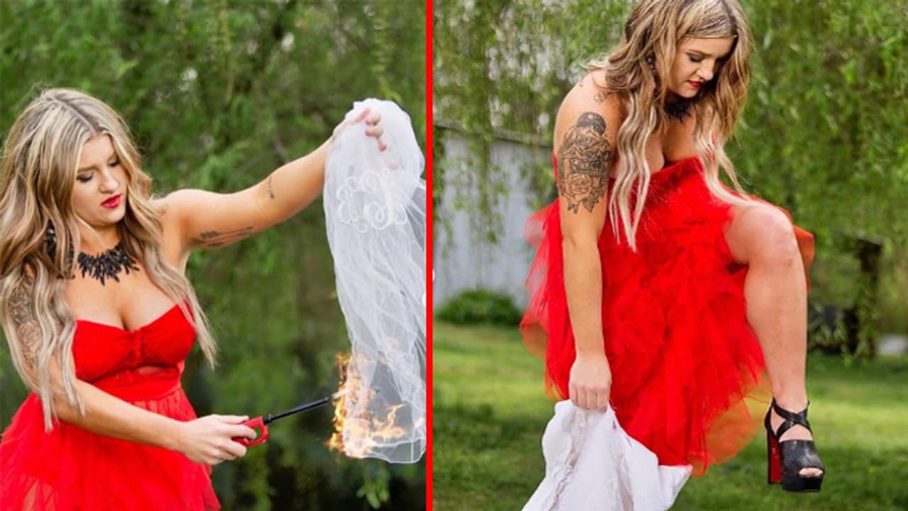 महिला एक खूबसूरत रेड ड्रेस में नजर आती है। सबसे पहले उसने अपनी वेडिंग ड्रेस का एक हिस्सा आग के हवाले कर दिया, इसके बाद शैंपेन खोलते हुए तलाक का जश्न शुरू किया।