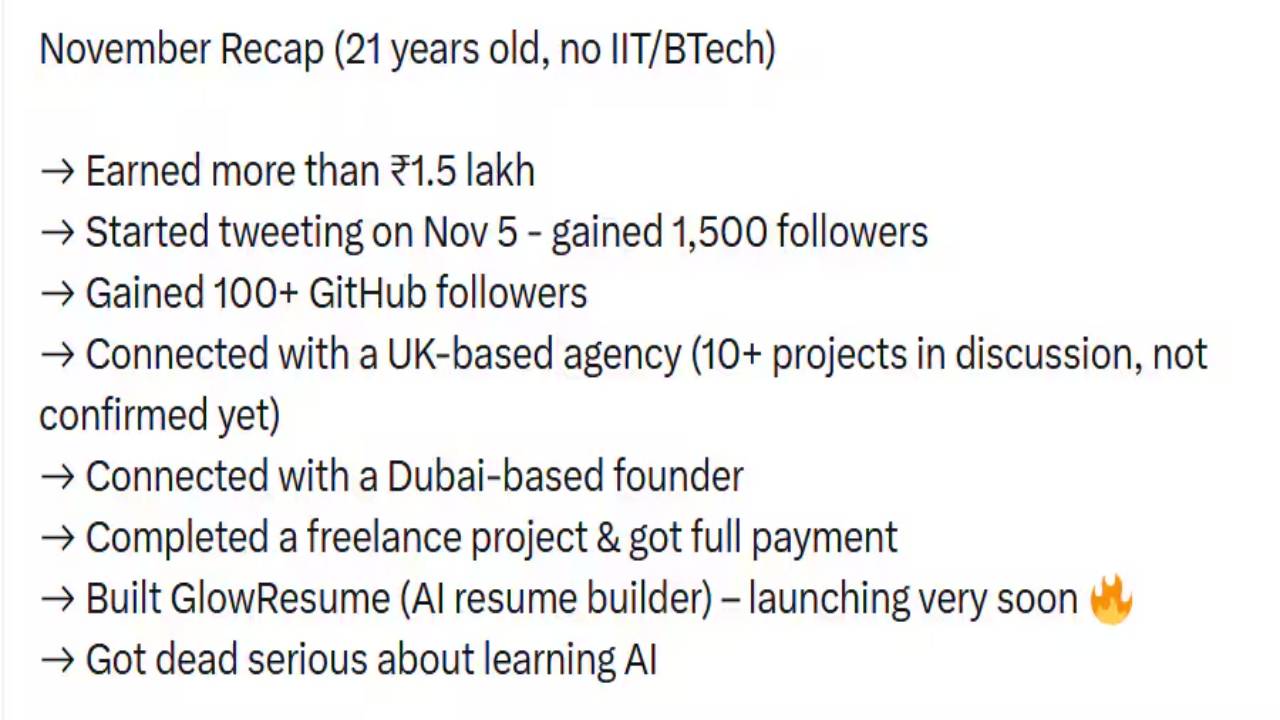 इस युवक ने अपनी सोशल मीडिया पोस्ट में बताया कि आईआईटी से या बी.टेक की डिग्री न होने के बावजूद, वह ₹1.5 लाख की कमाई कर रहा है। वे अब एआई के बारे में और जानने की दिशा में काम कर रहे हैं। हिंदुस्तान टाइम्स की रिपोर्ट के मुताबिक, "नवंबर रिकैप (21 साल, आईआईटी/बीटेक नहीं)। ₹1.5 लाख से ज़्यादा कमाए हैं। इस बारे में उसने 5 नवंबर को ट्वीट करना शुरू किया था। अब तक उसके साथ 1,500 फ़ॉलोअर्स जुड़ चुके हैं। इसके साथ ही यूके स्थित एक एजेंसी से जुड़े 10 से ज़्यादा प्रोजेक्ट्स को लेकर उसकी चर्चा जारी है। वो जल्द इसे फाइनल करने के बाद काम शुरु कर सकता है।