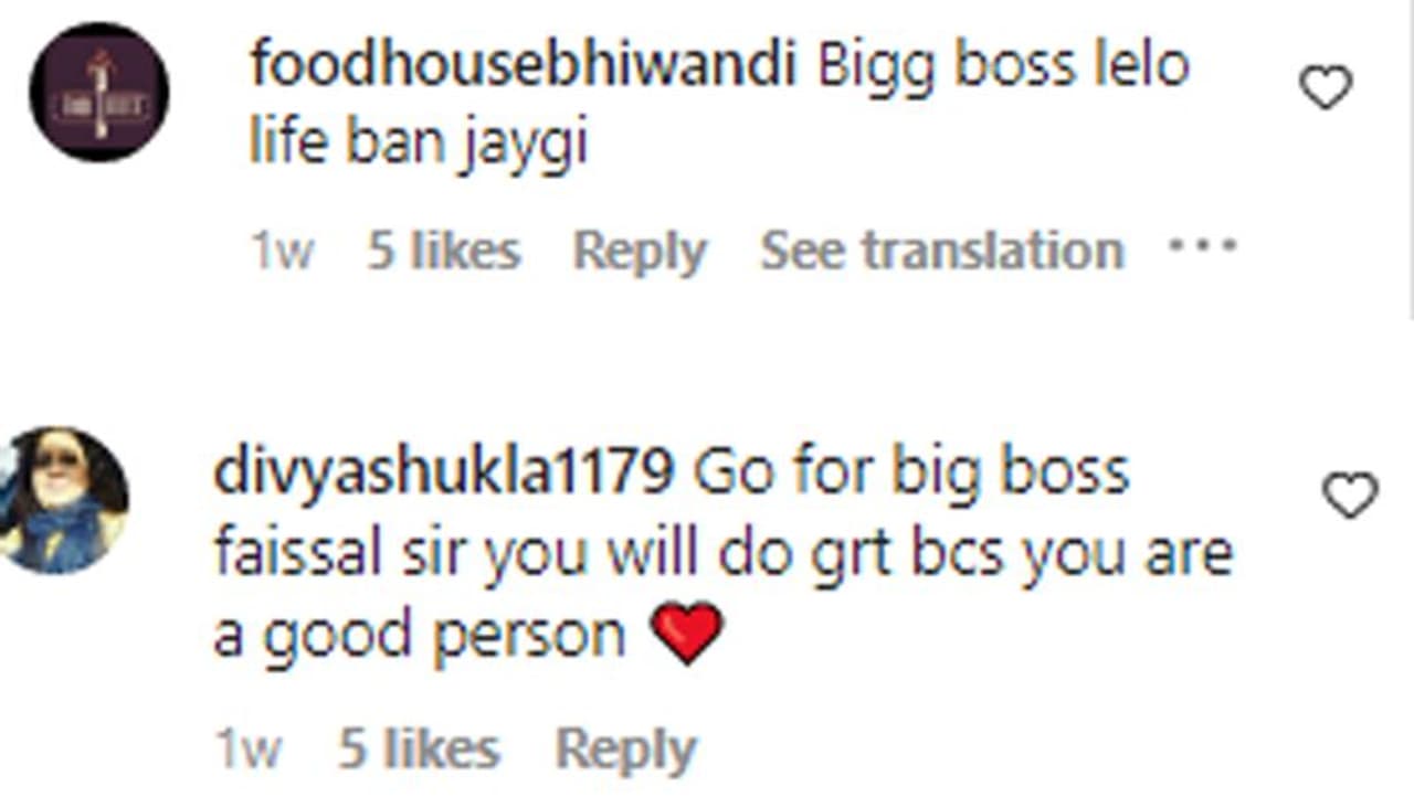 एक यूजर ने लिखा है, "बिग बॉस ले लो। लाइफ बन जाएगी।" एक यूजर ने लिखा है, "बिग बॉस में जाइए फैजल सर। आप बेहतर करेंगे, क्योंकि आप अच्छे इंसान हैं।"