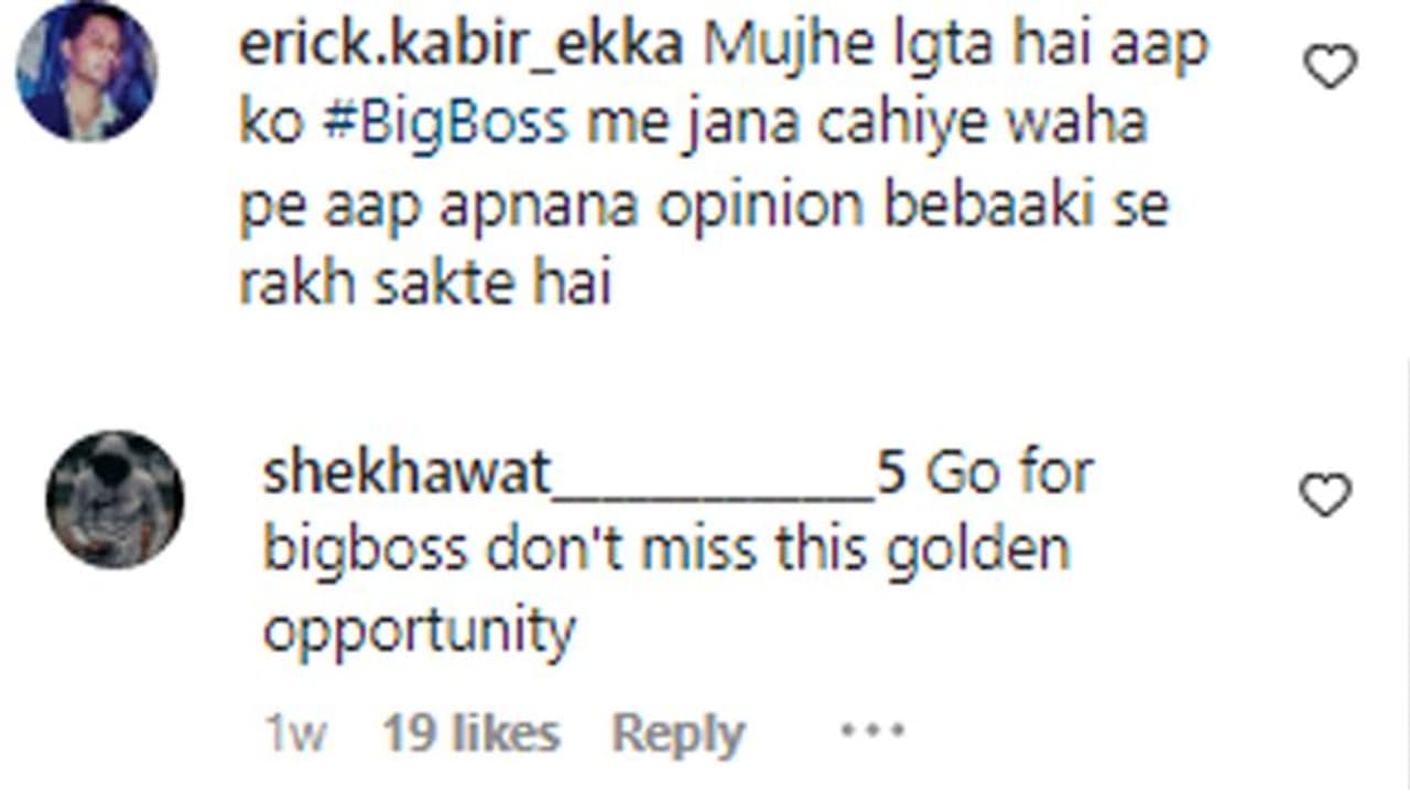 फैजल खान के वीडियो पर कमेंट करते हुए एक सोशल मीडिया यूजर ने लिखा है, "मुझे लगता है कि आपको 'बिग बॉस' में जाना चाहिए। वहां आप अपना ओपिनियन बेबाकी से रख सकते हैं।" एक यूजर कमेंट है, "बिग बॉस में जाओ। सुनहरा मौका मत छोड़ो।"