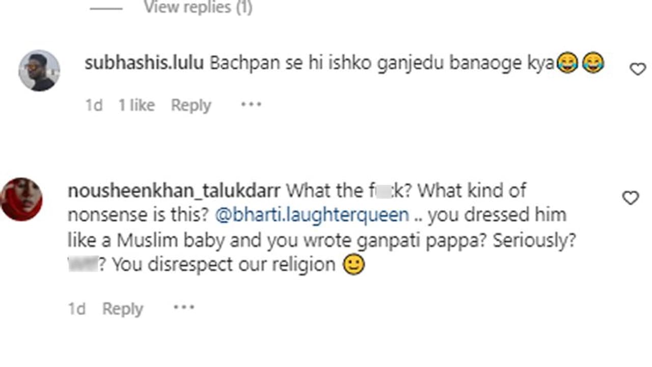 एक यूजर ने गाली देते हुए लिखा है, "यह क्या बकवास है? तुमने उसे मुस्लिम बेबी की तरह ड्रेस पहनाई और लिख रही हो गणपति बप्पा? सीरियसली? तुमने हमारे धर्म का अपमान किया है।" एक यूजर ने पूछा है, "बचपन से ही इसे गंजेड़ी बनाओगी क्या?"