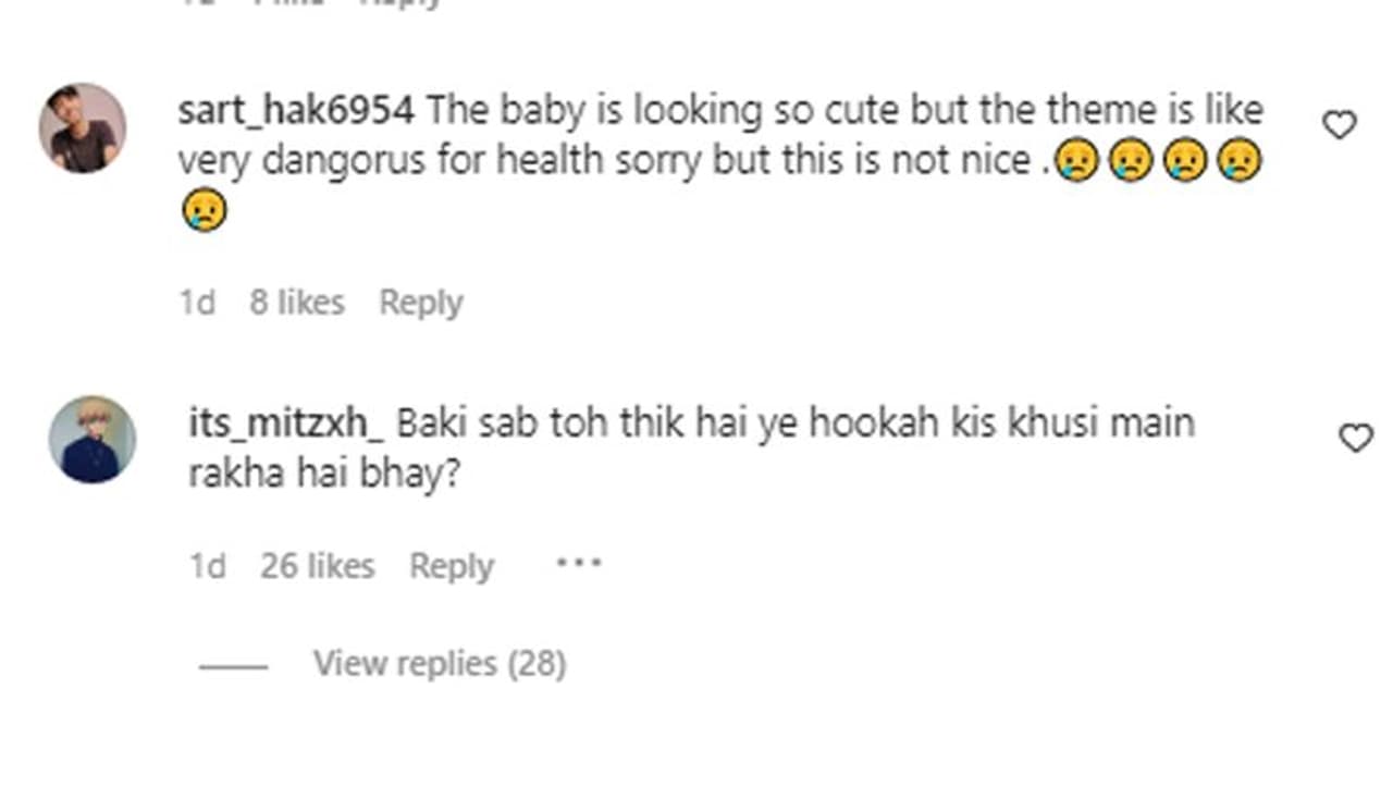 भारती की तस्वीर शेयर करते ही सोशल मीडिया यूजर्स ने उन्हें ट्रोल करना शुरू कर दिया। एक सोशल मीडिया यूजर ने कमेंट करते हुए पूछा है, "बाकी सब तो ठीक है, ये हुक्का किस ख़ुशी में रखा है भाई?" एक यूजर ने कमेंट किया, "बेबी बहुत क्यूट लग रहा है। लेकिन थीम हेल्थ के लिए बहुत ही खतरनाक है। माफ़ कीजिए यह अच्छी बात नहीं है।"