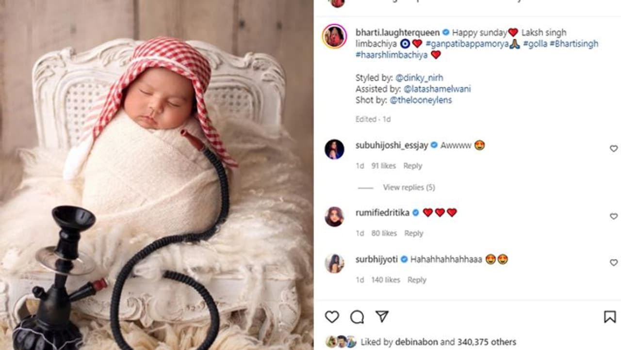 भारती ने अपने गोले यानी लक्ष की तस्वीर साझा करते हुए कैप्शन में लिखा है, "'हैप्पी सन्डे लक्ष लिम्बचिया।" इसके साथ उन्होंने हार्ट की इमोजी शेयर की हैं और साथ में गणपति बप्पा मोरया, गोला, भारती सिंह और हर्ष लिम्बचिया को हैशटैग किया है। भारती ने तस्वीर के साथ लक्ष के स्टाइल के लिए सेलेब्रिटी स्टाइलिस्ट दिनकी निर्थ, उन्हें असिस्ट करने के लिए लताशा मलवानी और शॉट के लिए बेबी फोटोशूट में माहिर फोटोग्राफर तरवीन को क्रेडिट दिया है।
