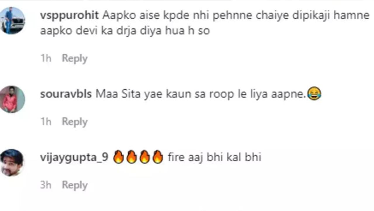 दीपिका की फोटो देखने के बाद एक सोशल मीडिया यूजर ने लिखा है, "आपको ऐसे कपड़े नहीं पहनने चाहिए दीपिका जी, हमने आपको देवी का दर्जा दिया है।" एक अन्य यूजर ने लिखा, "मां सिया ये कौनसा रूप ले लिया आपने।" एक यूजर का कमेंट है, "दीपिका जी ये उम्मीद नहीं थी आपसे।" एक यूजर का कमेंट है, "ये आपका कौनसा अवतार है। सॉरी देखकर बिलकुल भी अच्छा नहीं लगा।"