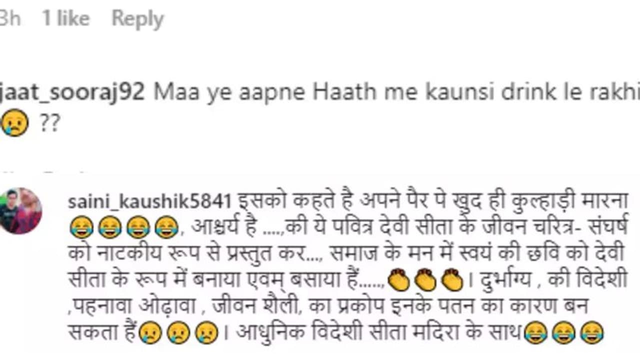 कुछ यूजर्स ने दीपिका के हाथ में नज़र आ रहे गिलास को लेकर भी सवाल उठाया है। मसलन एक यूजर ने लिखा है, "मां ये आपने हाथ में कौनसी ड्रिंक ले रखी है।" एक अन्य यूजर का कमेंट है, "इसको कहते हैं, अपने पैर पर खुद ही कुल्हाड़ी मारना। आश्चर्य है कि ये पवित्र देवी सीता के जीवन चरित्र-संघर्ष को नाटकीय रूप से प्रस्तुत कर समाज के मन में स्वयं की छवि देवी सीता के रूप में बनाया एवं बसाया है। दुर्भाग्य कि विदेशी पहनावा, ओढ़ावा, जीवन शैली का प्रकोप इनके पतन का कारण बन सकता है। आधुनिक विदेशी सीता मदिरा के साथ।"