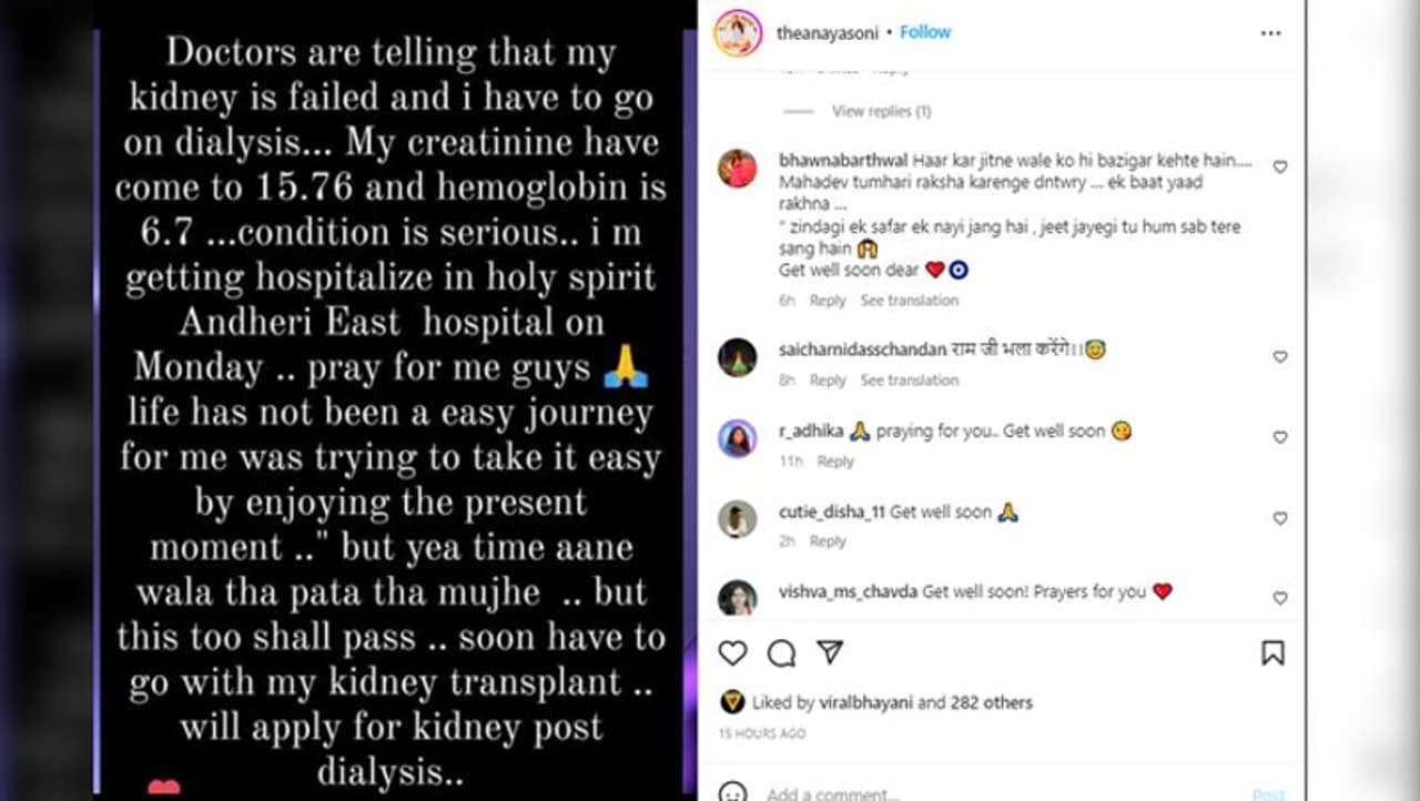 अनाया ने शनिवार रात अपने सोशल मीडिया हैंडल से एक पोस्ट साझा की, जिसमें उन्होंने अपना हाल बयां करते हुए लिखा है, "डॉक्टर्स कह रहे है कि मेरी किडनी फेल हो गई है और मुझे डायलिसिस पर जाना होगा। मेरा क्रिएटिनिन 15.76 पर आ गया है और मेरा हीमोग्लोबिन 6.7 बचा है। हालत गंभीर है। सोमवार को मैं अंधेरी ईस्ट, मुंबई के होली स्प्रिट अस्पताल में भर्ती हो रही हूं। दोस्तों मेरे लिए दुआ कीजिए।"