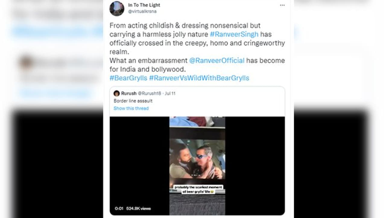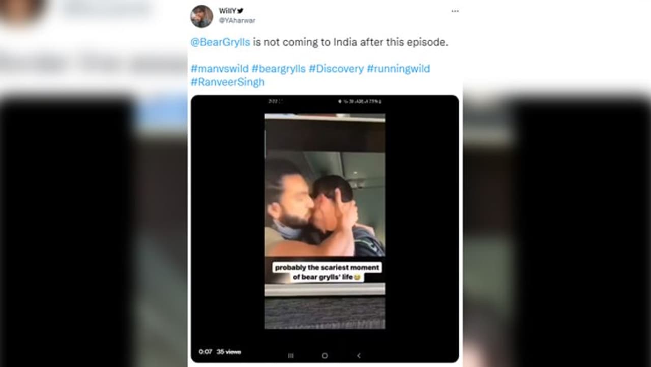 दरअसल, शो से रणवीर सिंह की एक क्लिप सोशल मीडिया अपर वायरल हो रही है, जिसमें वे आक्रामकता के साथ बिना रुके बियर ग्रिल्स (Bear Grylls) के गाल और गले पर लगातार Kiss किए जा रहे हैं। सोशल मीडिया यूजर्स को रणवीर का यह व्यवहार बेहद बुरा लगा है और लोग तरह-तरह की मीम बनाकर उन्हें ट्रोल कर रहे हैं। कुछ इस क्लिप को शेयर कर निराशा जता रहे हैं और इसे बॉर्डर लाइन असॉल्ट बता रहे हैं। यहां तक कि खुद को फिल्म क्रिटिक बताने वाले फिल्म अभिनेता और प्रोड्यूसर कमाल राशिद खान उर्फ़ केआरके ने भी रणवीर को ट्रोल किया है। केआरके ने वीडियो शेयर करते हुए लिखा है, "बियर ग्रिल्स भी सोच रहा होगा कि ये मैंने जिंदगी की कौनसी गलती कर दी, ऐसे जंगली को शो में लेकर।"