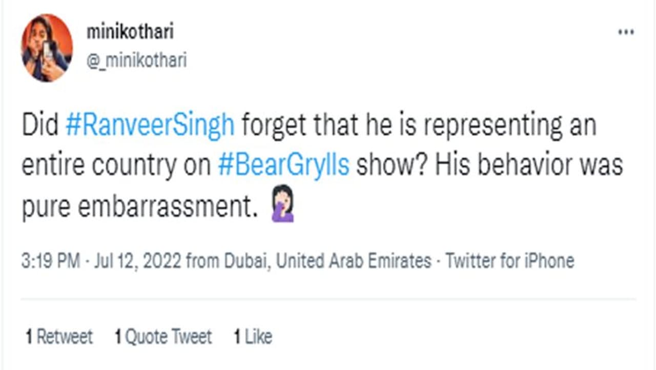 सोशल मीडिया यूजर्स की बात करें तो एक ने लिखा है, "क्या रणवीर सिंह भूल गए हैं कि बियर ग्रिल्स के शो में वे पूरे देश को रिप्रेजेंट कर रहे हैं। उनका व्यवहार पूरी तरह शर्मिंदगी भरा था।"