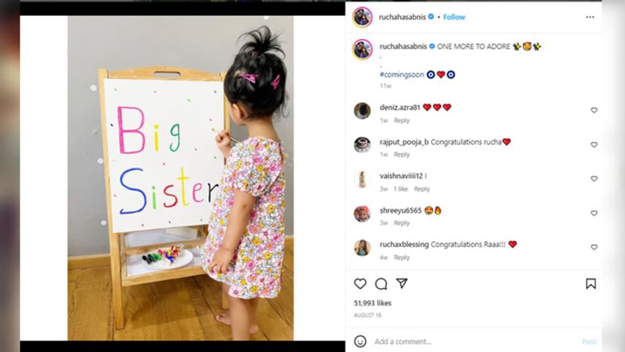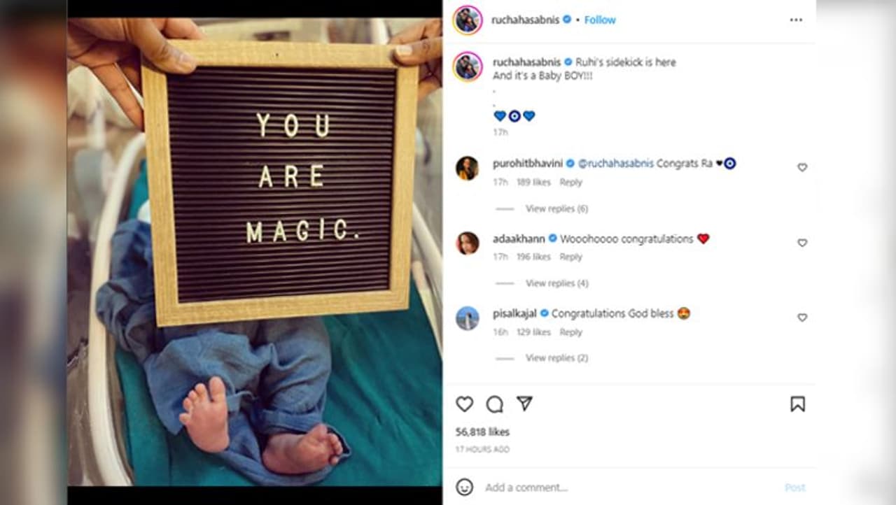 एक्ट्रेस ने तस्वीर को कैप्शन देते हुए लिखा है, "रूही का साइडकिक यहां हैं और यह एक लड़का है।" रुचा ने जैसे ही सोशल मीडिया पर पोस्ट साझा की, उनके फ्रेंड्स और फैन्स उन्हें बधाई देने लगे। भवानी पुरोहित दवे, अदा खान, काजल पिसल और मोहम्मद नाजिम खिलजी जैसे रुचा के दोस्तों ने उन्हें बधाई दी है। आदिश्री जोशी नाम की एक इंस्टा यूजर का कमेंट है, "बधाई हो मौसी। अपने छोटे भाई से मिलने के लिए एक्साइटेड हूं।" शीतल प्रधान नाम की एक इंस्टा यूजर का कमेंट है, "अमेजिंग रुचा। बधाई हो। हमारे लड़के एक ही उम्र के होंगे।"