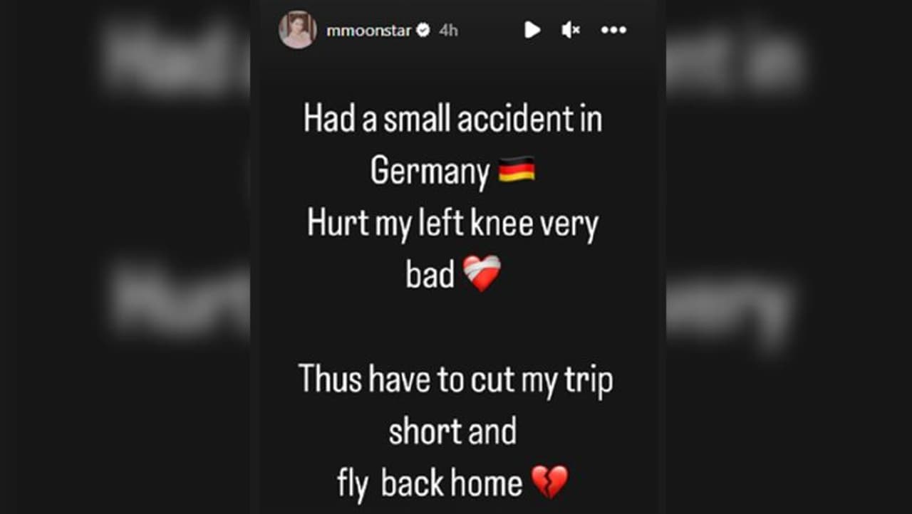 मुनमुन दत्ता ने अपनी इंस्टाग्राम स्टोरी पर दर्द बयां करते हुए लिखा है, "जर्मनी में एक छोटी सी दुर्घटना हो गई। मेरा घुटना बुरी तरह चोटिल हुआ है। इसलिए मुझे अपनी यात्रा छोटी करनी है और घर वापस जाना है।" रिपोर्ट्स के मुताबिक़, दो दिन पहले ही मुनमुन दत्ता स्विट्ज़रलैंड के इंटरलेकन से ट्रेन पकड़कर जर्मनी पहुंची थीं। वहां वे जिनके यहां रह रही थीं, उनके यहां से लजीज खाने की एक तस्वीर भी सोशल मीडिया पर फैन्स के साथ साझा की।