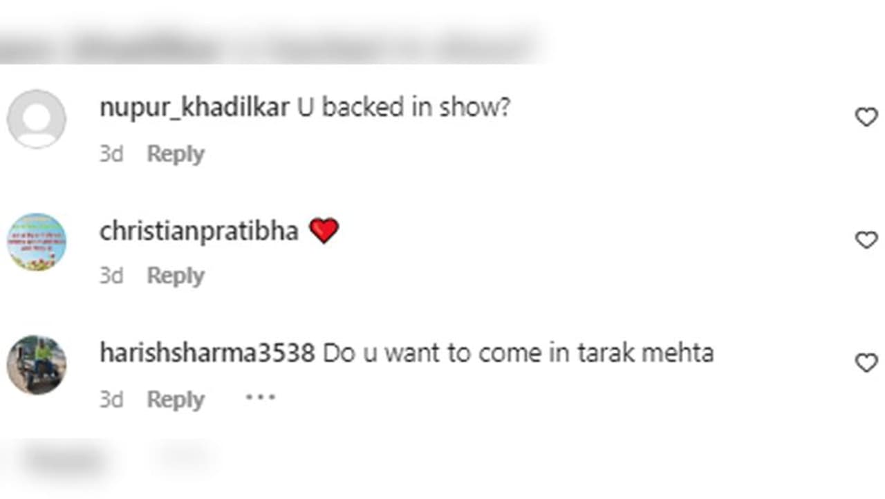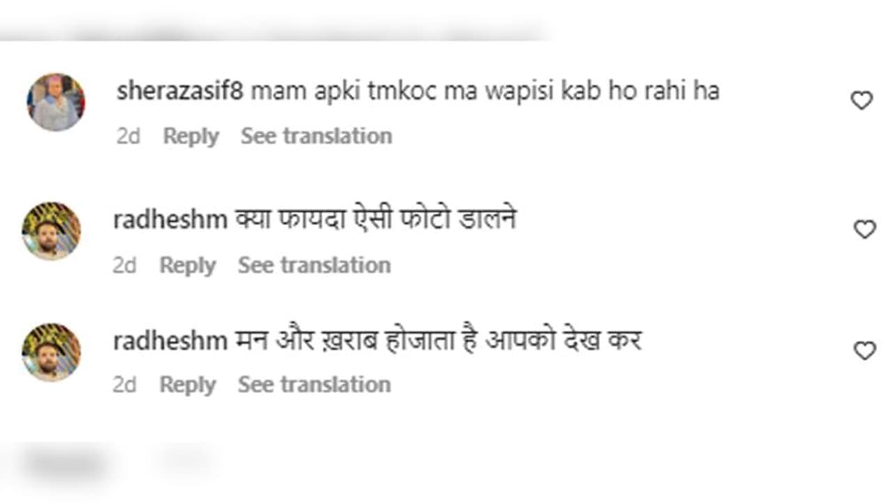 एक यूजर ने पूछा है, "मैम, आपकी 'तारक मेहता का उल्टा चश्मा' में वापसी कब हो रही है?" एक यूजर ने कमेंट करते हुए लिखा है, "क्या फायदा ऐसी फोटो डालके। मन और खराब हो जाता है आपको देखकर।"