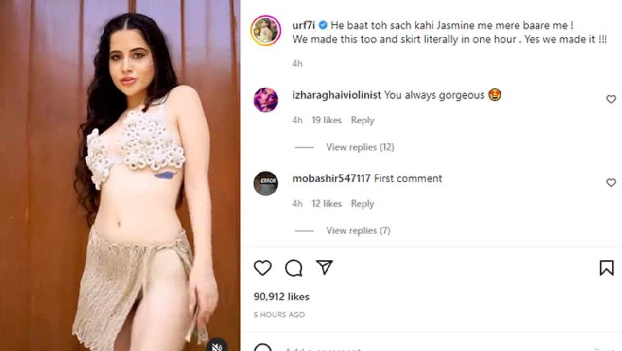 वीडियो के साथ उर्फी ने कैप्शन में लिखा है, "बात तो सच कही जैस्मिन ने मेरे बारे में! हमने इसे भी बना दिया और स्कर्ट वाकई एक घंटे में बन गया। जी हां हमने इसे बना लिया।" उर्फी का यह शॉर्ट स्कर्ट इतना रिवीलिंग है कि उनका अंडरगारमेंट भी उसमें से साफ़ दिखाई दे रहा है। अपने लुक को कंप्लीट करने के लिए उर्फी ने पेन्सिल हील्स पहने हैं और ओपन मिडिल पार्टेड हेयर्स रखे हैं। सोशल मीडिया यूजर्स को अट्रैक्ट करने के लिए उर्फी अपने कातिलाना मूव्स भी दिखा रही हैं।