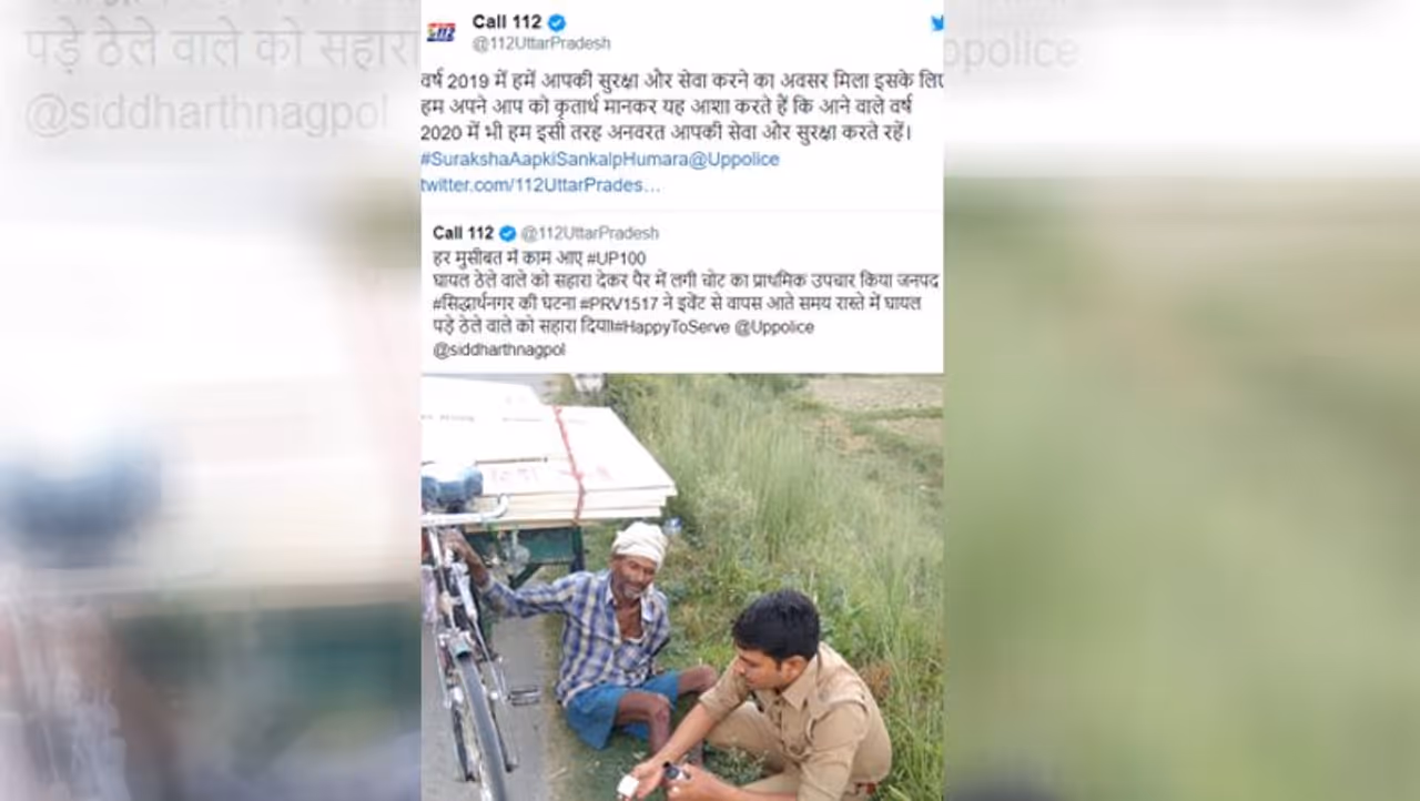 डायल 112 के आफिशियल टि्वटर हैंडल एक फोटो के साथ मैसेज पोस्ट किया गया। फोटो में एक पुलिसकर्मी घायल ठेलिया चालक का सड़क किनारे प्रथामिक उपचार करते दिख रहा है। मैसेज में लिखा- साल 2019 में हमें आपकी सुरक्षा और सेवा करने का अवसर मिला, इसके लिए हम अपने आप को कृतार्थ मानकर यह आशा करते हैं कि आने वाले वर्ष 2020 में भी हम इसी तरह अनवरत आपकी सेवा और सुरक्षा करते रहें।
