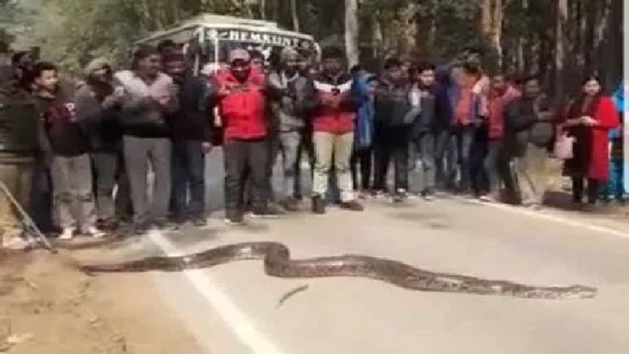 लखीमपुर खीरी ( Uttar Pradesh) । दूधवा टाइगर रिजर्व से होकर दिल्ली-नेपाल जाने वाली सड़क पर एक 20 फीट लंबा अजगर आ गया। इस अजगर का वजन एक क्विंटल बनाया जा रहा है। इसके कारण आवागमन बाधित हो गया और जाम लग गया। हालांकि वन विभाग की निगरानी में विशालकाय अजगर जंगल में चला गया, जिसके बाद दिल्ली-नेमाप मार्ग पर आवागम शुरू हो सका।