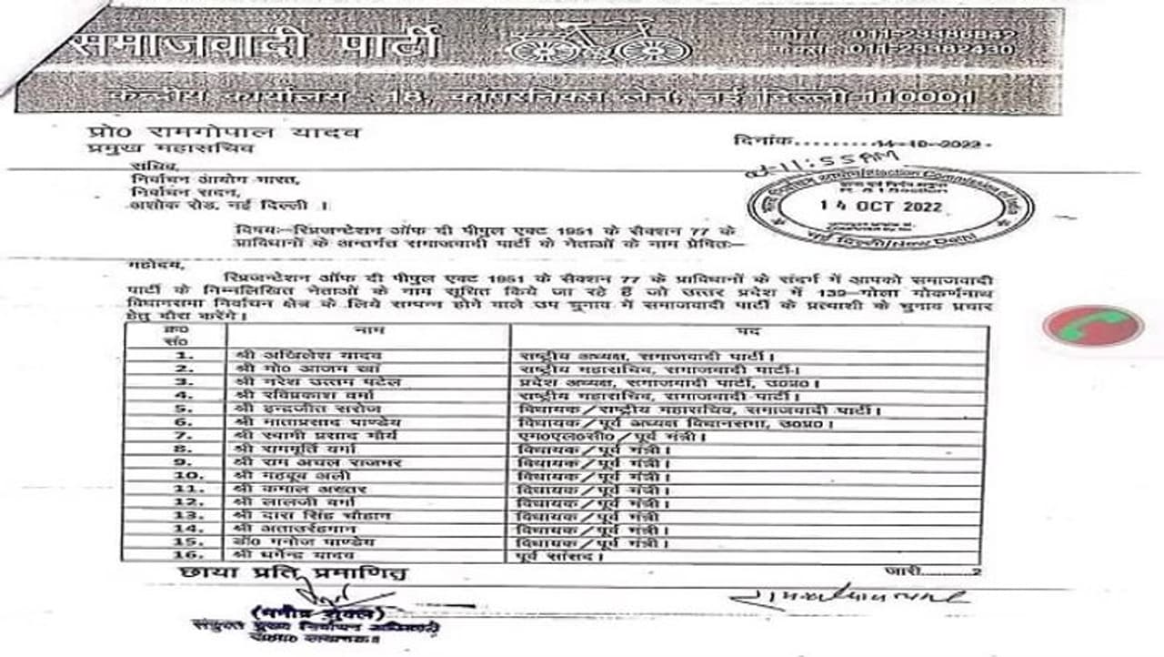यूपी के गोला गोकर्णनाथ सीट पर होने वाले उपचुनाव में समाजवादी पार्टी ने अपने स्टार प्रचारकों की सूची जारी कर दी है। सपा प्रमुख अखिलेश यादव सहित 39 प्रचारकों को इस सूची में जगह मिली है। वहीं इस लिस्ट से चाचा शिवपाल यादव का नाम गायब है।