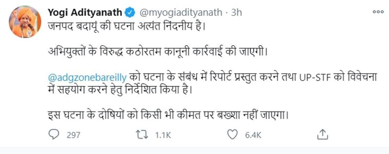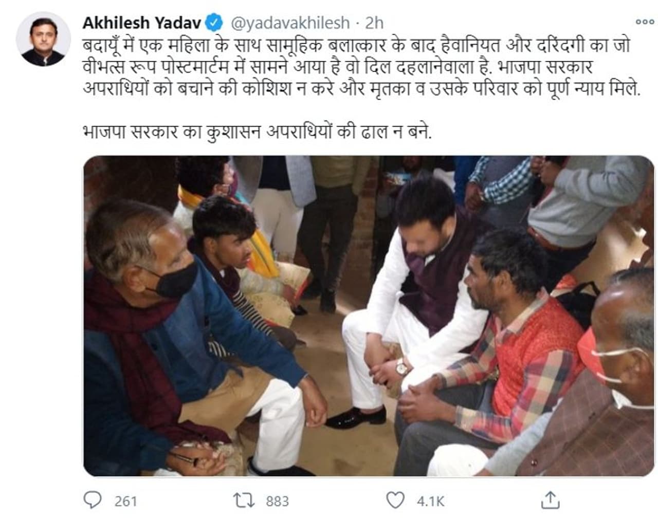 बदायू की घटना को लेकर सपा सुप्रीमो और पूर्व सीएम अखिलेश यादव ने ट्वीट किया है, जिसमें उन्होंने लिखा है कि बदायूं में एक महिला के साथ सामूहिक बलात्कार के बाद हैवानियत और दरिंदगी का जो वीभत्स रूप पोस्टमार्टम में सामने आया है वो दिल दहलानेवाला है। भाजपा सरकार अपराधियों को बचाने की कोशिश न करें और मृतका व उसके परिवार को पूर्ण न्याय मिले। भाजपा सरकार का कुशासन अपराधियों की ढाल न बने।