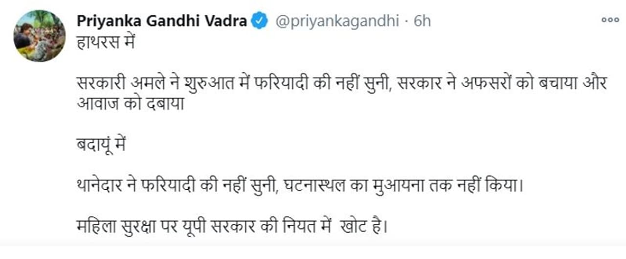 प्रियंका गांधी ने ट्वीट पर लिखा है कि हाथरस में सरकारी अमले ने शुरुआत में फरियादी की नहीं सुनी। सरकार ने अफसरों को बचाया और आवाज को दबाया। बदायूं में थानेदार ने फरियादी की नहीं सुनी, घटनास्थल का मुआयना तक नहीं किया। महिला सुरक्षा पर यूपी सरकार की नियत में खोट है।
