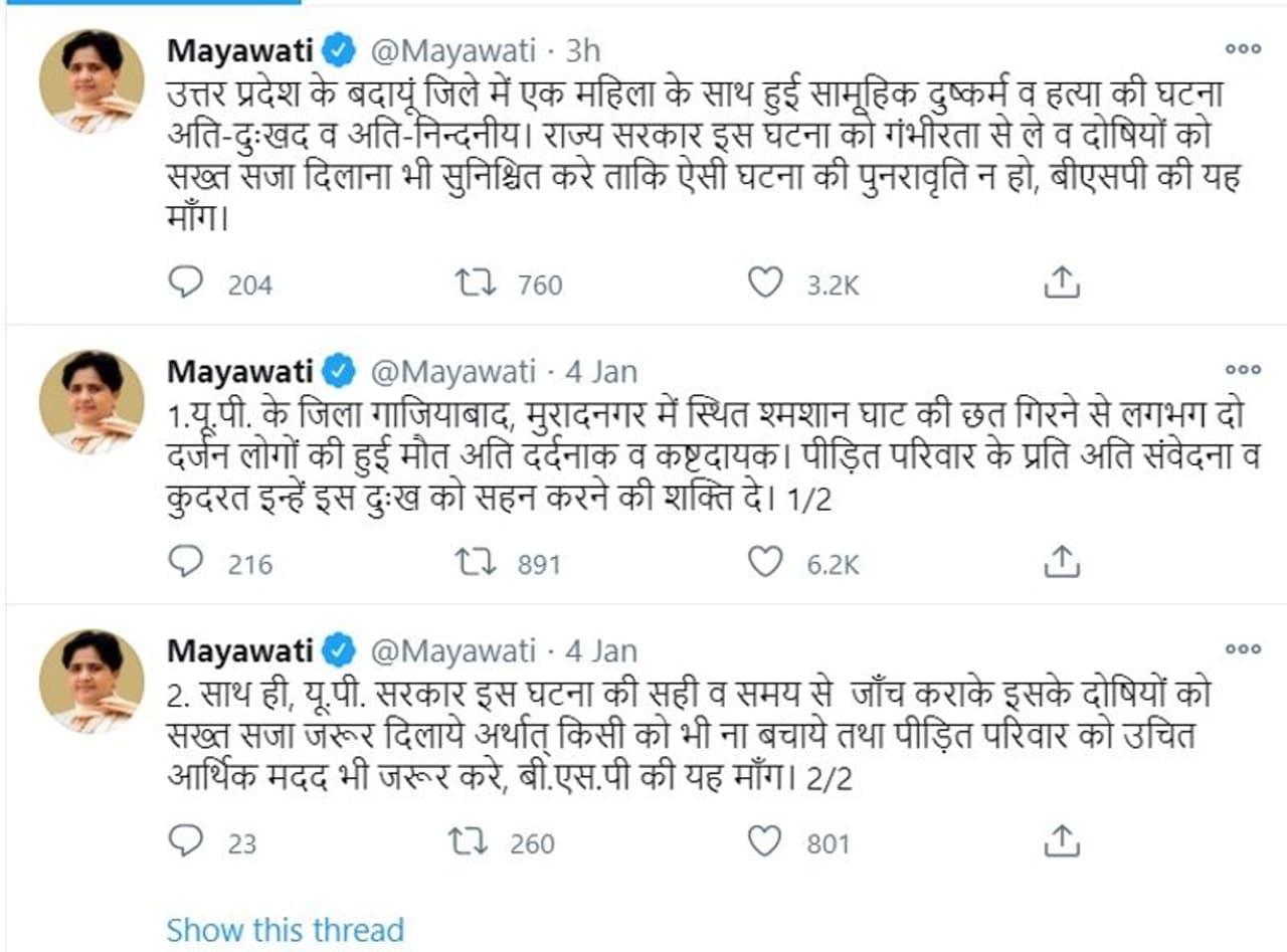 बसपा सुप्रीमो और पूर्व मुख्यमंत्री मायावती ने लिखा है कि उत्तर प्रदेश के बदायूं जिले में एक महिला के साथ हुई सामूहिक दुष्कर्म व हत्या की घटना अति-दुःखद व अति-निन्दनीय। राज्य सरकार इस घटना को गंभीरता से ले व दोषियों को सख्त सजा दिलाना भी सुनिश्चित करे ताकि ऐसी घटना की पुनरावृति न हो, बीएसपी की यह मांग।