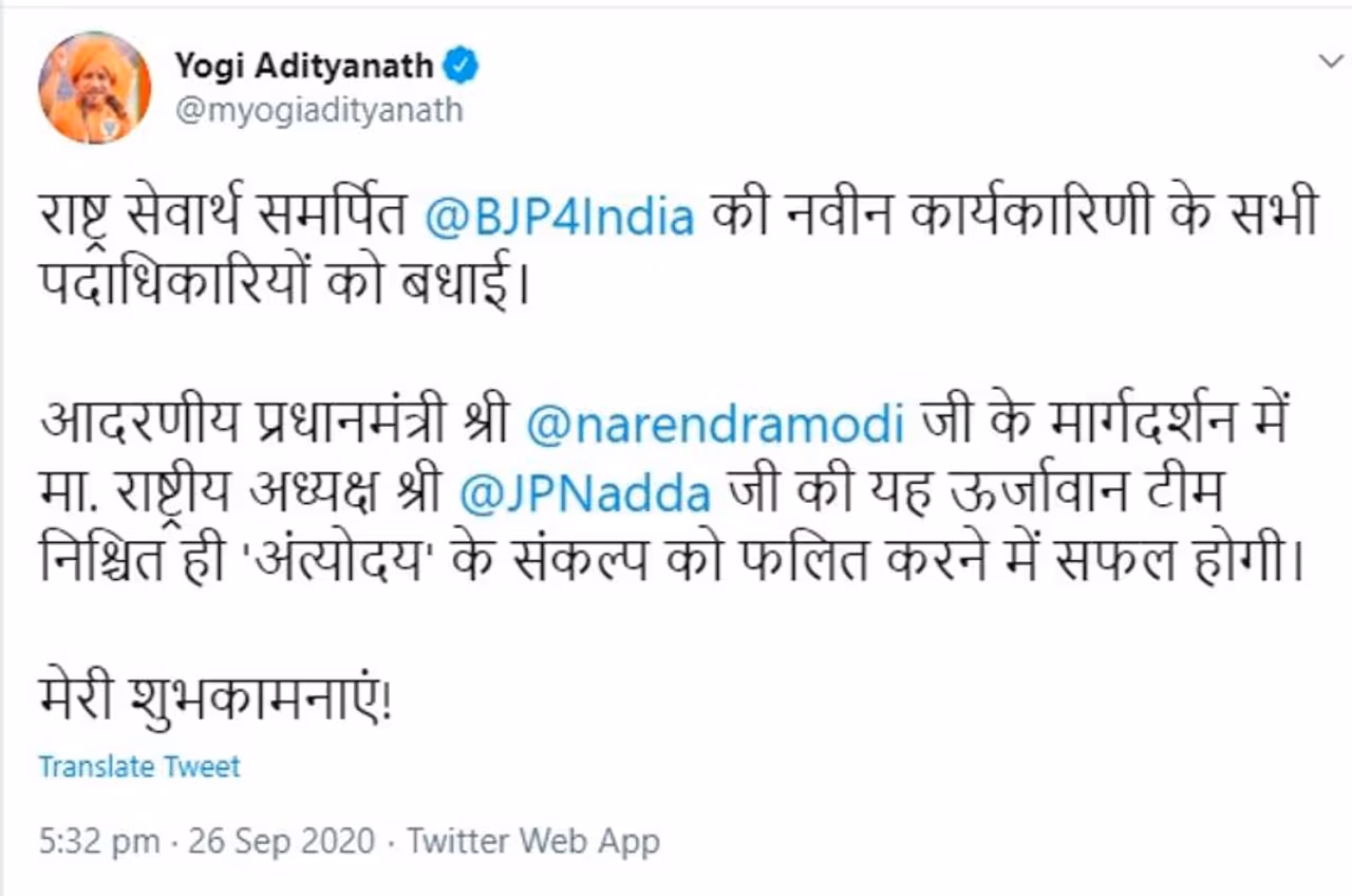 नवनियुक्त पदाधिकारियों को बधाई देते हुए यूपी के सीएम योगी आदित्यनाथ ने कहा," राष्ट्र सेवार्थ समर्पित केंद्रीय टीम की नवीन कार्यकारिणी के सभी पदाधिकारियों को बधाई।" उन्होंने कहा कि आदरणीय प्रधानमंत्री श्री नरेंद्र मोदी जी के मार्गदर्शन में मा. राष्ट्रीय अध्यक्ष श्री जेपी नड्डा की यह ऊर्जावान टीम निश्चित ही 'अंत्योदय' के संकल्प को फलित करने में सफल होगी। मेरी शुभकामनाएं!