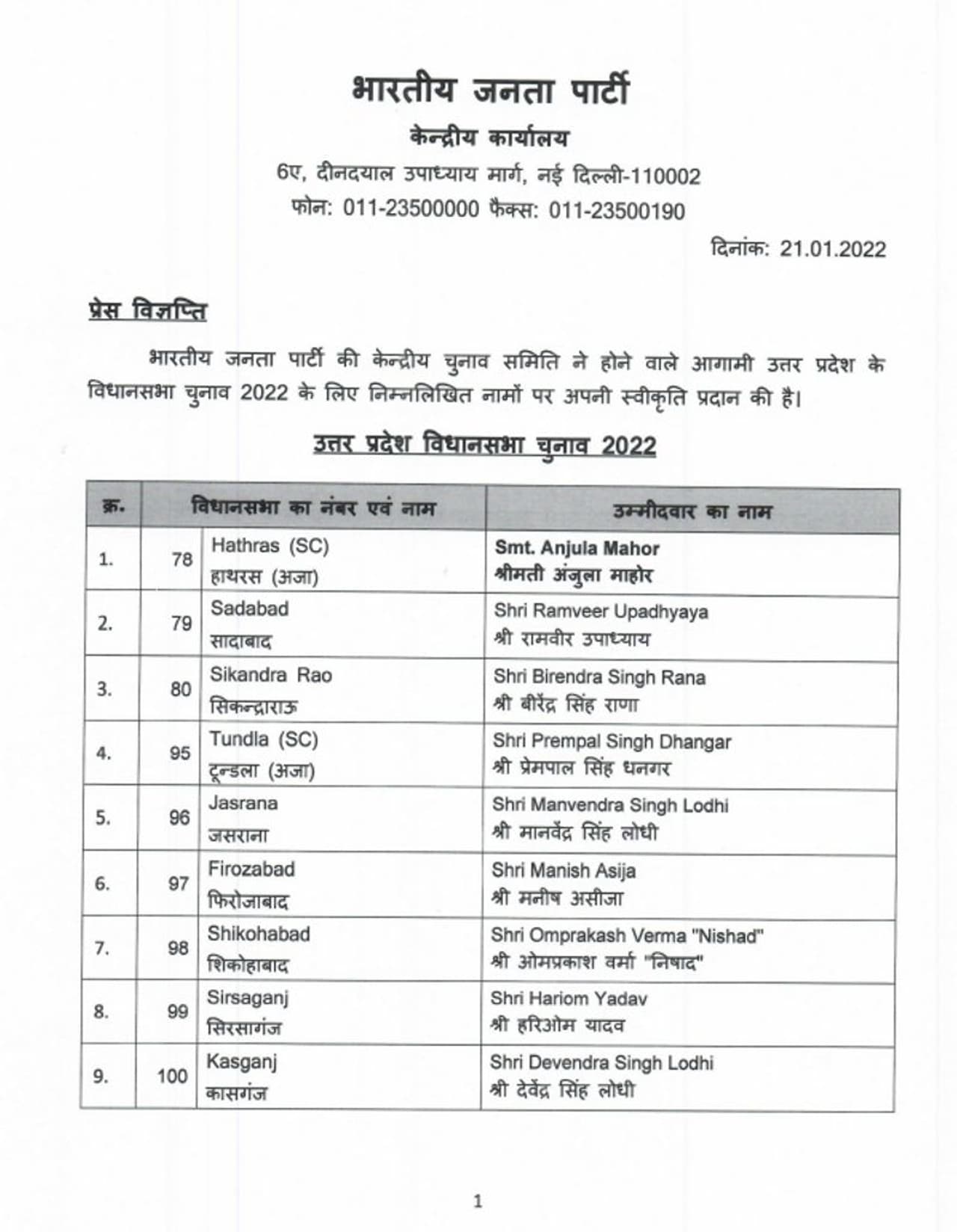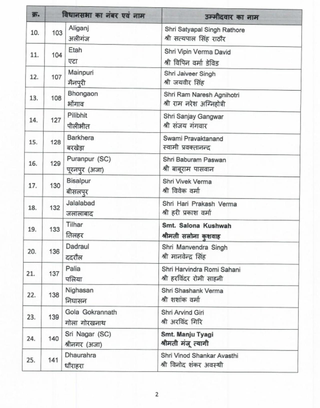 वहीं तीसरी लिस्ट में हाल ही में विधानसभा उपाध्यक्ष के पद और समाजवादी पार्टी से इस्तीफ़ा देकर बीजेपी में आने वाले नितिन अग्रवाल को हरदोई सदर से पार्टी ने प्रत्याशी बनाया है। वहीं बिधूना से रिया शाक्य को टिकट दिया है। जारी की गई लिस्ट में 85 टिकटों में 15 महिलाओं के नाम पर मुहर लगी है।