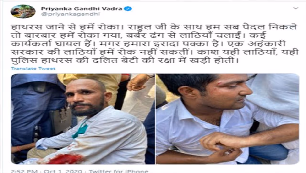 उधर, प्रियंका गांधी वाड्रा ने ट्वीट कर आरोप लगाया कि उन्हें हाथरस जाने से रोका गया। जब वह राहुल के साथ पैदल चलने लगे तो बार-बार पुलिस ने रोका और बर्बरता से लाठीचार्ज किया। कई कार्यकर्ता घायल हैं। मगर हमारा इरादा पक्का है। काश यही लाठियां, यही पुलिस हाथरस की दलित बेटी की रक्षा में खड़ी होती।