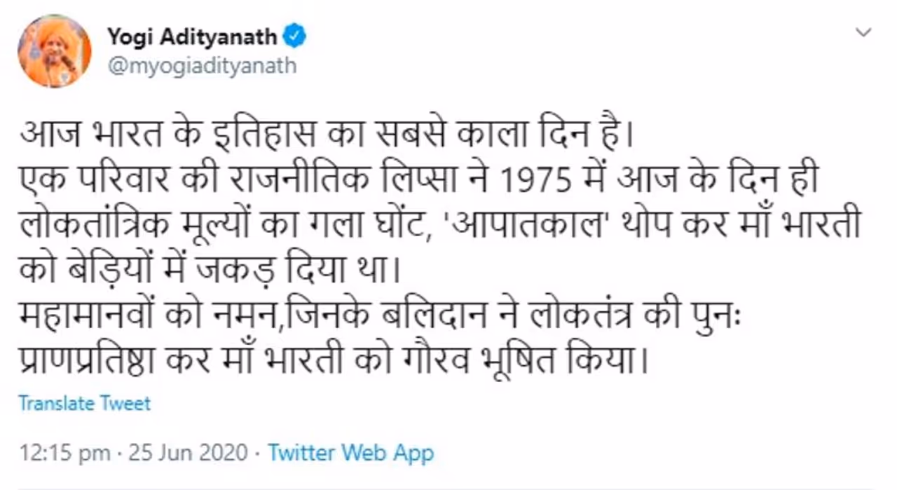 मुख्यमंत्री योगी आदित्यनाथ ने ट्वीट कर कांग्रेस पार्टी पर निशाना साधते हुए कहा कि आज भारत के इतिहास का सबसे काला दिन है। एक परिवार की राजनीतिक लिप्सा ने 1975 में आज के दिन ही लोकतांत्रिक मूल्यों का गला घोंट, 'आपातकाल' थोप कर मां भारती को बेड़ियों में जकड़ दिया था। सीएम योगी ने ट्वीट करते हुए कहा कि उन महामानवों को नमन, जिनके बलिदान ने लोकतंत्र की पुनः प्राणप्रतिष्ठा कर मां भारती को गौरव भूषित किया।
