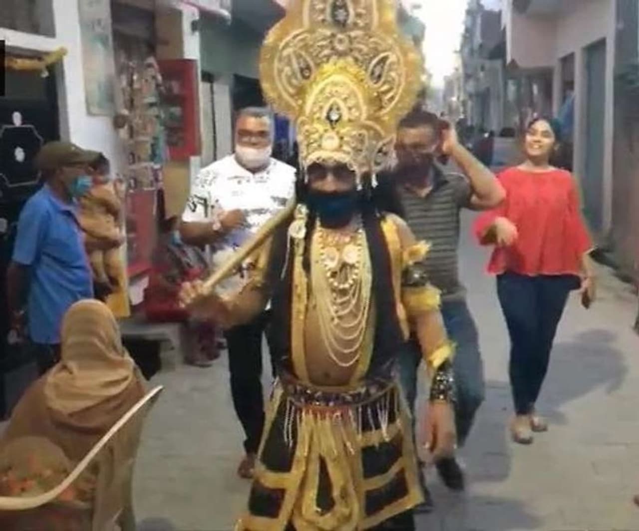 लखनऊ (Uttar Pradesh) । यूपी में कोरोना का संक्रमण तेजी से बढ़ रहा है। इसे देखते हुए सख्ती बरती जा रही है। वहीं, लोगों को जागरुक करने के लिए पुलिस-प्रशासन को तरह-तरह के हथकडे अपनाने पड़ रहे हैं। इसी बीच मुरादाबाद में एक कलाकार को 'यमराज' बनाकर सड़क पर उतरना पड़ा। मुरादाबाद में इस कलाकार ने एक भैंसा के साथ शहर में काफी देर तक भ्रमण किया। साथ ही यह कहता दिखा कि यम हैं हम, मास्क लगाओ नहीं तो आ रहा हूं। बता दें कि गुरुवार को 8,490 नए मामलें सामने आए थे। जबकि प्रदेश में 39 लोगों की कोरोना संक्रमण से मौत हो गई। इसके पहले बुधवार को यह संख्या 40 थी।