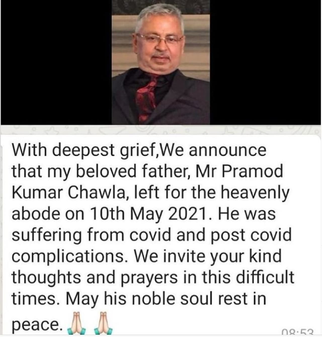 पीयूष चावला ने अपने पोस्ट में लिखा है कि 'गहरे दुख के साथ बताना पड़ रहा हे कि मेरे प्यारे पिता का स्वर्गवास हो गया है। वह कोविड और कोविड कॉम्प्लीकेशन्स से जूझ रहे थे। हम इस कठिन समय में आपकी प्रार्थनाओं की जरूरत हैं। भगवान उनकी आत्मा को शांति दे।' पीयूष ने इस पोस्ट के साथ एक इमोशन कैप्शन भी दिया। उन्होंने लिखा, 'जिंदगी पिता जी के बिना अब पहले जैसी नहीं होगी। आज मैंने अपना शक्ति का स्तंभ खो दिया है।