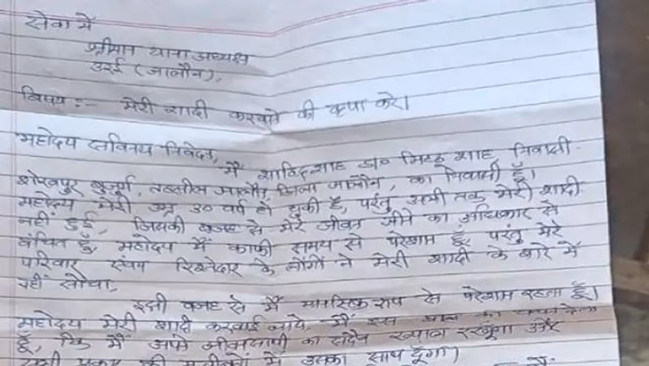 जालौन: उत्तर प्रदेश के जिले जालौन से अजीबोगरीब मामला सामने आया है। दरअसल एक युवक प्रार्थनापत्र लेकर थाने पहुंचा है और वह हाथ जोड़कर कह रहा है कि साहब मेरी शादी करा दो। घरवालें मेरी शादी नहीं करा रहे है और इस वजह से मैं मानसिक रूप से पागल हो रहा है। प्लीज आप मेरी शादी करा दीजिए। युवक ने प्रभारी निरीक्षक को प्रार्थना पत्र देते हुए अपनी शादी की गुहार लगाई है। इतना ही नहीं उसका कहना यह भी है कि यह संदेश प्रधानमंत्री नरेंद्र मोदी तक पहुंचाने की भी अपील की है।