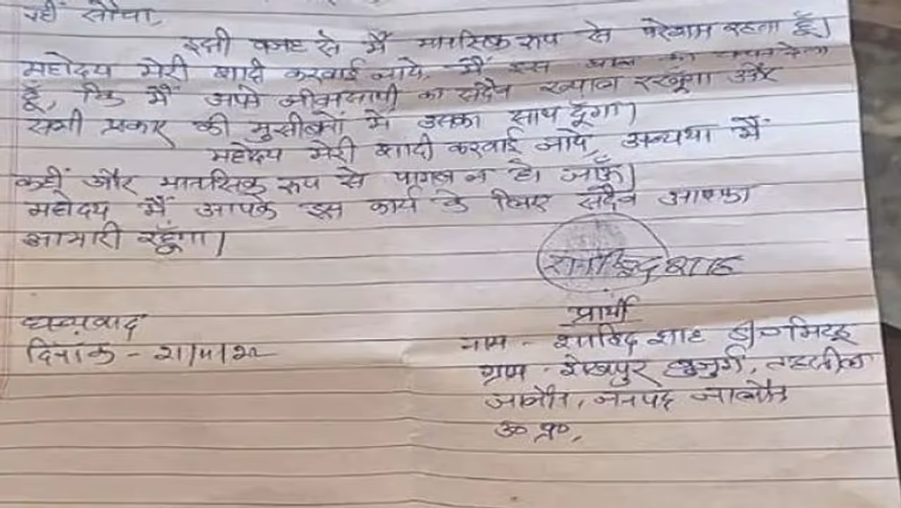 जानकारी के अनुसार यह मामला शहर के उरई कोतवाली का है। यहां जालौन तहसील के शेखपुर बुजुर्ग का निवासी शाहित शाह पुत्र मिट्ठू ही कोतवाली में अपनी शादी कराने को लेकर प्रार्थना पत्र लेकर पहुंचा था। वहां उसने कोतवाली के अतिरिक्त प्रभारी निरीक्षक अरविंद यादव को प्रार्थना पत्र देते हुए कहा कि उसकी उम्र तीस साल हो चुकी है लेकिन अभी तक उसकी शादी नहीं हुई है। इस वजह से वह मानसिक रूप से काफी परेशान है, अगर उसकी शादी नहीं कराई गई तो वह पागल हो जाएगा। । उसका कहना है कि तीस साल की उम्र होने के बाद भी परिवार और रिश्तेदार के लोगों ने अभी तक मेरी शादी के बारे में नहीं सोचा है। उसने अपनी यह फरियाद पीएम मोदी तक पहुंचाने की गुहार भी लगाई है।
