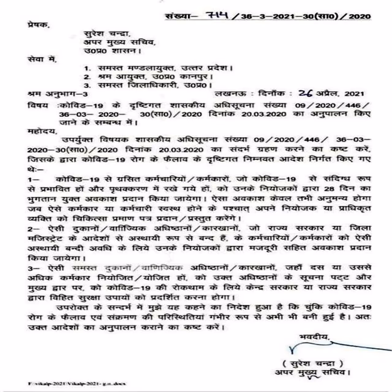 लखनऊ (Uttar Pradesh) । अब कोरोना वायरस से संक्रमित प्रदेश के किसी भी प्राइवेट संस्थान में काम करने वाले कर्मी का वेतन नहीं कटेगा। इस संबंध में सीएम योगी आदित्यनाथ ने सोमवार को आदेश जारी कर दिया है। आदेश के मुताबिक कोविड संक्रमित होने पर सरकारी के साथ अब प्राइवेट कर्मचारियों को 28 दिनों की पेड लीव मिलेगी। इसके साथ ही सरकार ने लॉकडाउन में सैलरी देने का आदेश जारी कर दिया है। अगर महीने भर का लॉकडाउन होता है तो कर्मचारी को सैलरी के साथ 28 दिन की छुट्टी भी मिलेगी।