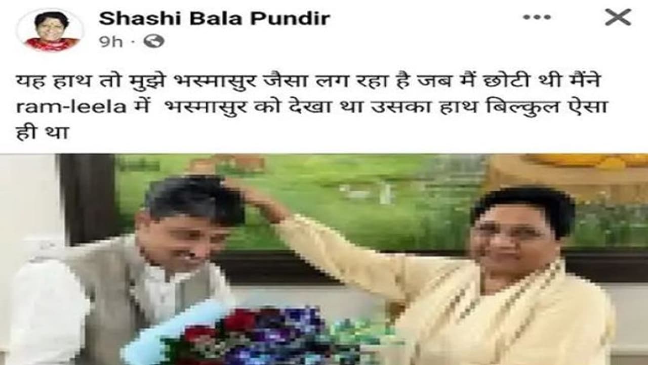 बीजेपी की पूर्व विधायिका शशि बाला पुंडीर ने सोशल मीडिया पर एक पोस्ट डाली हैं। जिसमें उन्होंने इमरान के सिर पर मायावती के साथ फोटो को साझा करते हुए लिखा कि यह हाथ तो मुझे भस्मासुर जैसा लग रहा है, जब मैं छोटी थी मैंने रामलीला में भस्मासुर को देखा था, उसका हाथ बिल्कुल ऐसा ही था। पूर्व विधायिका शशि कहती है कि मायावती जी बिना लक्ष्मी, रकम और धन लिए सिर पर हाथ रख दें, यह बहुत बड़ी बात है। वह चुनाव और पैसे के समय सिर पर हाथ रखती है। मायवती सिर पर हाथ रखकर भस्मासुर की तरह धन खींच लीती है और कंगाल कर देती है। हालांकि इमरान मसूद ने कुछ भी बोलने से मना कर दिया है।