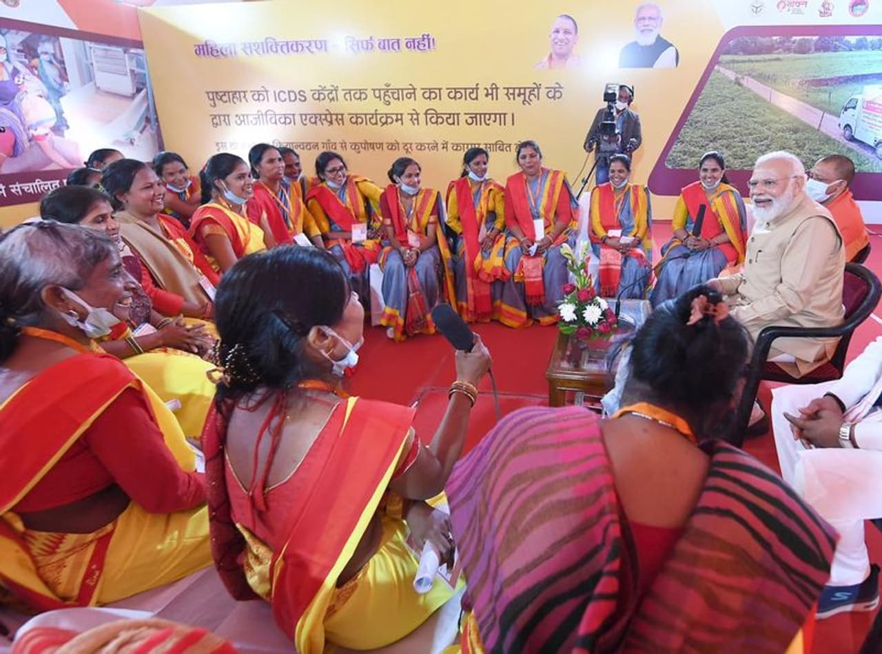 प्रधानमंत्री मोदी ने परेड ग्रांउड में यूपी की महिलाओं द्वारा संचालित स्वयं सहायता समूहों (SHG) की संचालकों के साथ बातचीत की। महिलाओं के साथ लगभग आधा घंटे बातचीत पीएम ने रिमोट का बटन दबा कर प्रयागराज में 202 202 पूरक पोषण निर्माण इकाइयों का शिलान्यास किया और महिलाओं द्वारा संचालित 1.60 लाख ‘स्वयं सहायता समूहों' के बैंक खाते में 1000 करोड़ रुपए की राशि ऑनलाइन ट्रांसफर की।