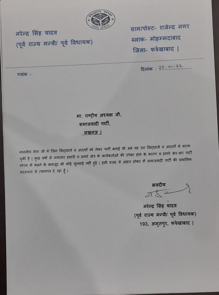 आपको बता दें कि समजावादी पार्टी से टिकट ने मिलने पर कई अन्य नेता भी पार्टी से किनारा कर चुके हैं। इसमें से कुछ नेताओं ने तो अन्य दलों की सदस्यता भी ले ली है। इसी कड़ी में फर्रूखाबाद से सात बार विधायक रहे नरेंद्र सिंह यादव ने पार्टी से इस्तीफा दे दिया है। इस्तीफा देने के साथ ही उन्होंने आरोप भी लगाया है कि पार्टी नेताजी के सिद्धांतों से भटक गई है।