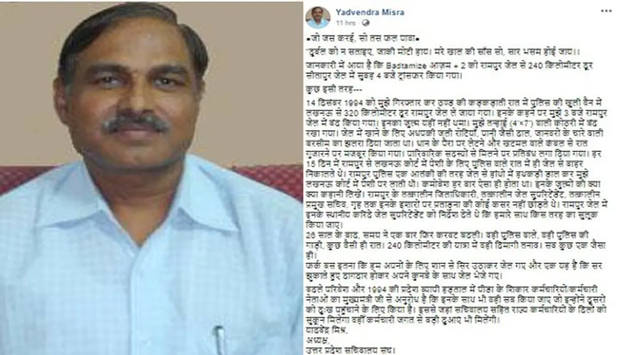 दरअसल आजम खान व उनके परिवार के जेल भेजे जाने पर खुशी जाहिर करने वाले सचिवालय में तैनात कर्मचारी संघ के अध्यक्ष यादवेंद्र मिश्रा हैं। खाद्य विभाग के समीक्षा अधिकारी के पद पर तैनात यादवेंद्र मिश्रा ने अपनी फेसबुक वाल पर अपना दर्द बयां किया है। उन्होंने अपने साथ हुए अन्याय की दास्तां को साझा करते हुए लिखा है कि 'जो जस करई, सो तस फल पावा.' 'दुर्बल को न सताइए, जाकी मोटी हाय, मरे खाल की सांस सो, सार भसम होई जाय। उन्होंने लिखा है 14 दिसंबर 1994 को मुझे गिरफ्तार कर ठण्ड की कड़कड़ाती रात में पुलिस की खुली वैन में लखनऊ से 320 किलोमीटर दूर रामपुर जेल ले जाया गया। इनके कहने पर मुझे रात 3 बजे रामपुर जेल में बंद किया गया। इनका जुल्म यहीं नहीं थमा, मुझे तन्हाई वाली 4 *7 की कोठरी में बंद रखा गया। जेल में खाने के लिए अधपकी जली रोटियां, पानी जैसी दाल, जानवरों के चारे वाली बरसीम का झलरा दिया जाता था। धान के पैरा पर लेटने और खटमल वाले कंबल से रात गुजारने पर मजबूर किया गया। पारिवारिक सदस्यों से मिलने पर प्रतिबंध लगा दिया गया।