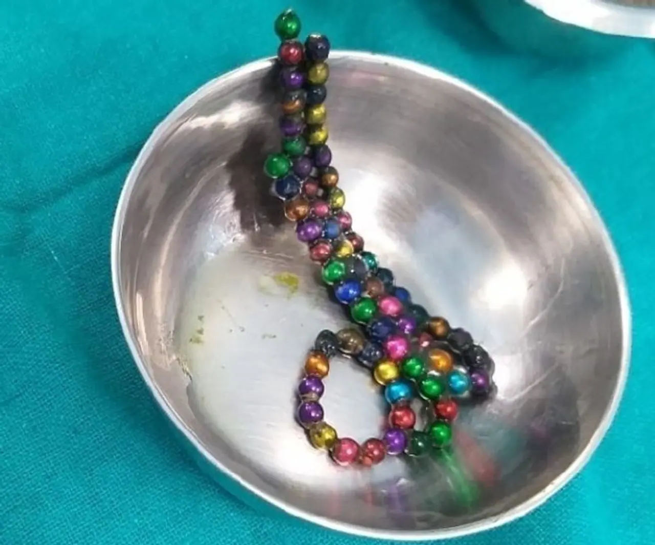 पेट में चीरा लगाने के दौरान उपकरण उसमें चिपकने लगे, जिससे पता चला की माला चुंबकयुक्त है। इसके बाद डॉक्टरों ने लोहे के उपकरण का सहारा लिया। आंत में चुंबक के मोती आपस में चिपक गए थे। इससे आंतों की चाल भी गड़बड़ा गई और उसमें कई सुराख हो गए। ये मोती छोटी और बड़ी आंत दोनों में पहुंच गए थे। इससे छोटी आंत में पांच और पेट के पीछे हिस्से में एक सुराख हो गया था।