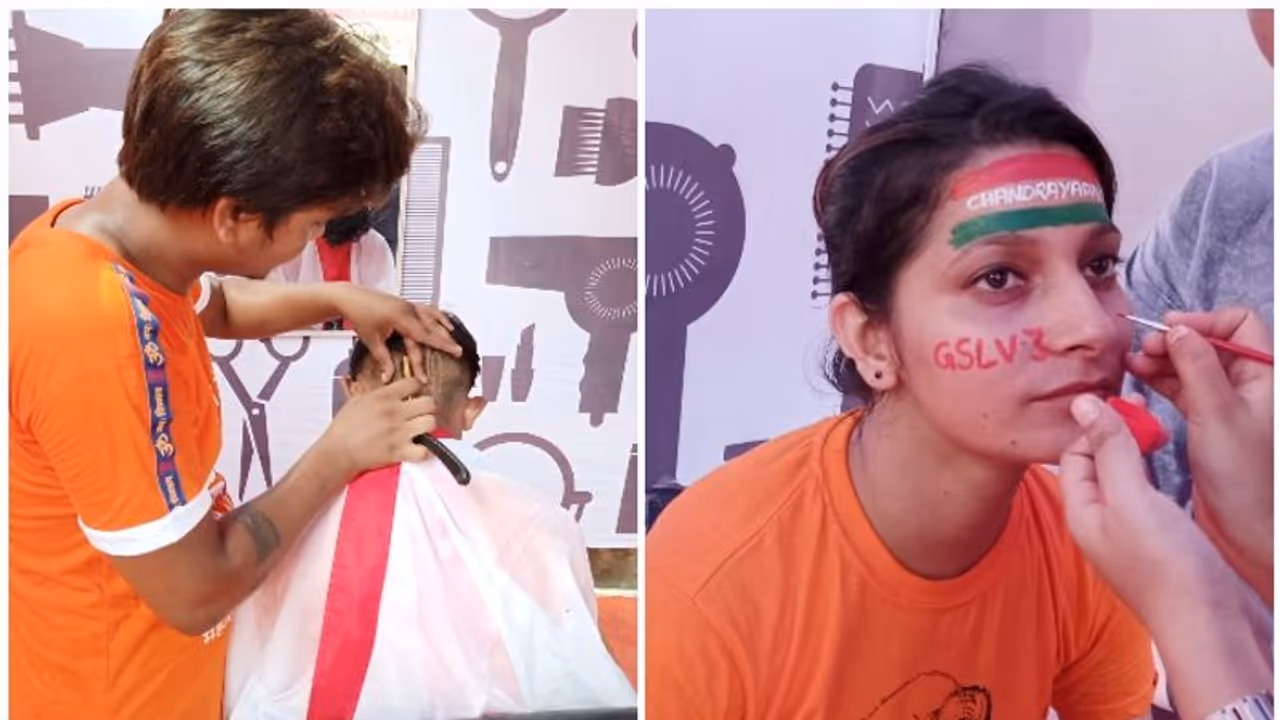सावन के पहले सोमवार को मुस्लिम युवक साजिद इकबाल ने कांवड़ियों के लिए फुट मसाज, हेड मसाज और हाथों के मसाज के लिए स्टॉल लगाया था। इकबाल की टीम थके हारे कांवड़ियों का मुफ्त में मसाज कर रही है। तभी कुछ युवा यहां चंद्रयान को लांच करने वाले जीएसएलवी मार्क थ्री के लोगो को हेयर कट में बनवाने पहुंचे। युवाओं ने भारत की इस उपलब्धि पर गर्व करते हुए इसका लोगो अपने हेड पर बनवाया है। अविनाश ने अपना हुनर दिखाते हुए रॉकेट जीएसएलवी मार्क थ्री की तस्वीर कांवड़िये के सिर पर उकेरी है। अनूठा हेयर कट करवाने वाले प्रतापगढ़ के गुलशन शर्मा ने कहा, "सुबह बाबा काशी विश्वनाथ का जलाभिषेक किया है। अब वापस घर जा रहा था तो मन में ख्याल आया कि लांचिंग टीम को शुभकामना कैसे दें, तो कटिंग करवा लिया।" वहीं कुछ युवतियों ने अपने माथे पर जीएसएलवी मार्क थ्री और चंद यान 2 लिखवाया।