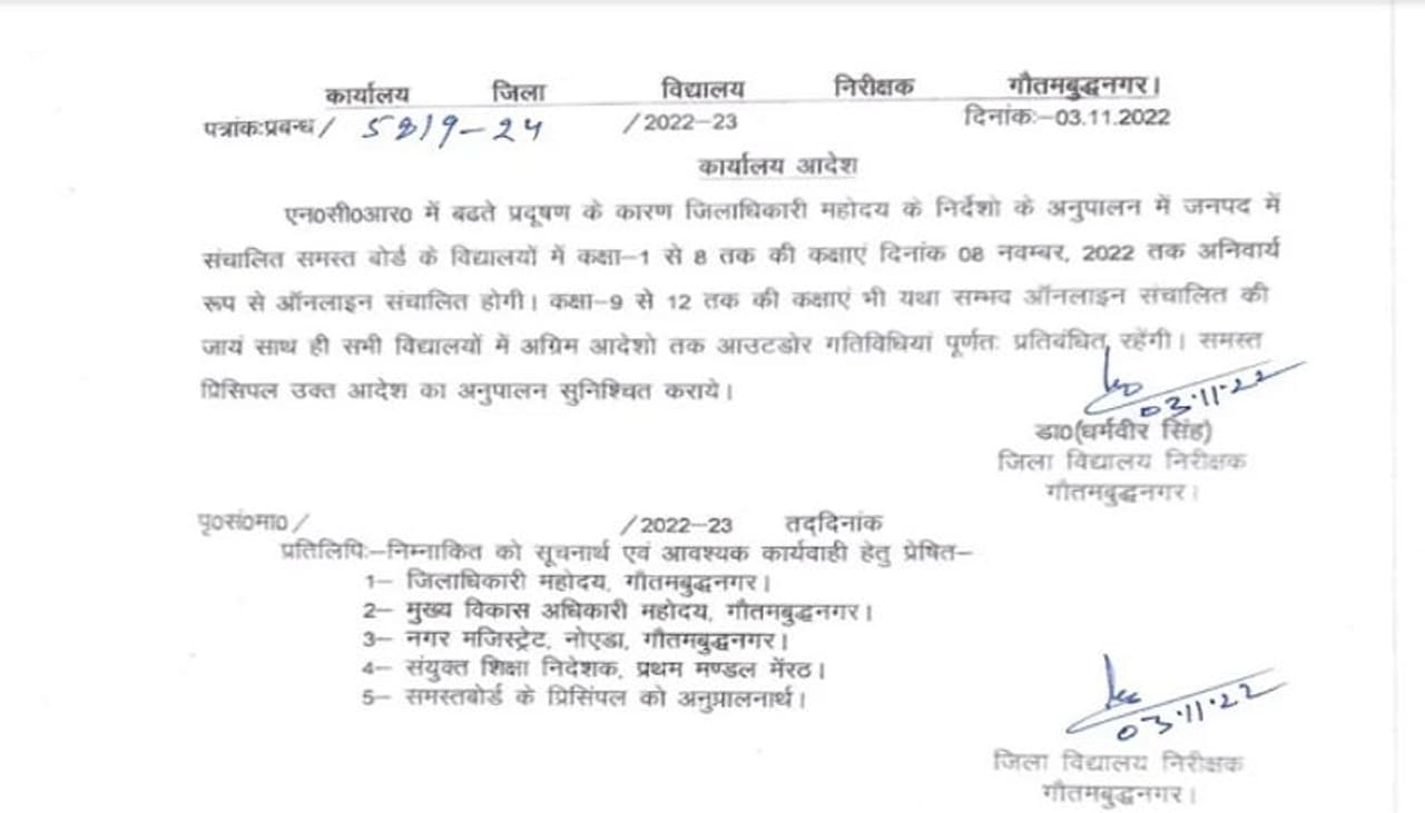 यूपी के नोएडा में कक्षा आठ तक के स्कूलों को ऑनलाइन संचालित करने का फैसला लिया गया है। बढ़ते वायु प्रदूषण और खराब होगी हवा की गुणवत्ता के मद्देनजर यह फैसला लिया गया है।