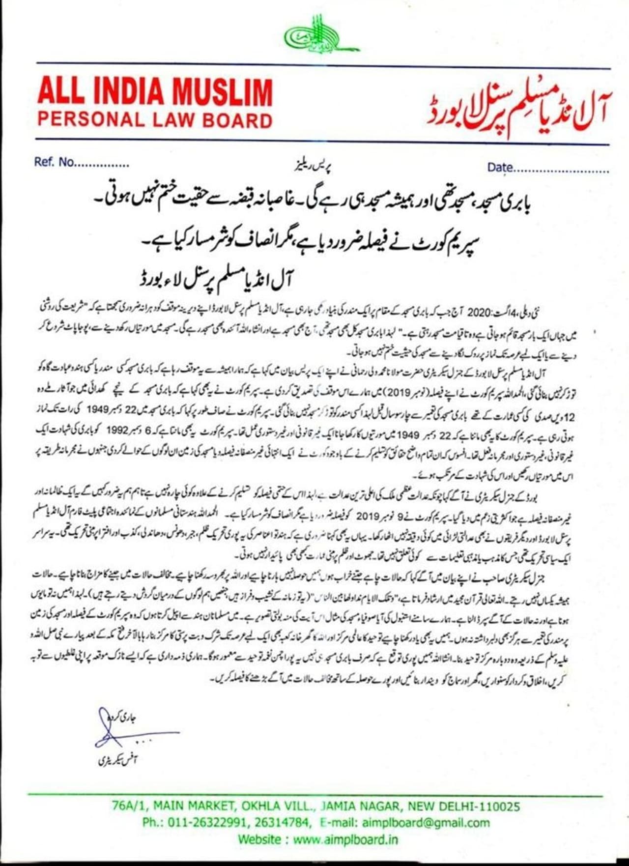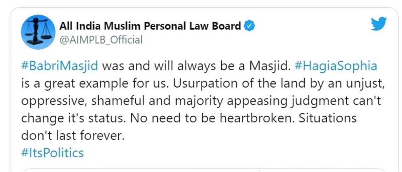 ऑल इंडिया मुस्लिम पर्सनल लॉ बोर्ड ने अपने ट्टीट में एक लेटर भी है, जिसके उर्दू में लिखा गया है कि 1500 साल प्राचीन विरासत समेटे यूनेस्को की विश्व विरासत में शामिल हागिया सोफिया म्यूजियम को लेकर बड़ी तब्दीली हुई। पिछले महीने जुलाई में टर्की के राष्ट्रपति रेचेप तैय्यब एर्दोगन ने इस ऐतिहासिक म्यूजियम को दोबारा मस्जिद में बदलने का आदेश दिया। राष्ट्रपति एर्दोगन ने 1934 के उस फैसले को पलट दिया, जिसके तहत 1434 में इस्तांबुल पर कब्जे के बाद उस्मानी सल्तनत द्वारा मस्जिद में तब्दील हुई हागिया सोफिया को एक म्यूजियम बना दिया गया था। इस ऐतिहासिक इमारत ने कई बार अपनी रंगतों को भी बदलते देखा है। जब ये इमारत बनाई गई तब ये एक भव्य चर्च हुआ करती थी और शताब्दियों तक ये चर्च ही रही, फिर इसे मस्जिद में तब्दील कर दिया गया।