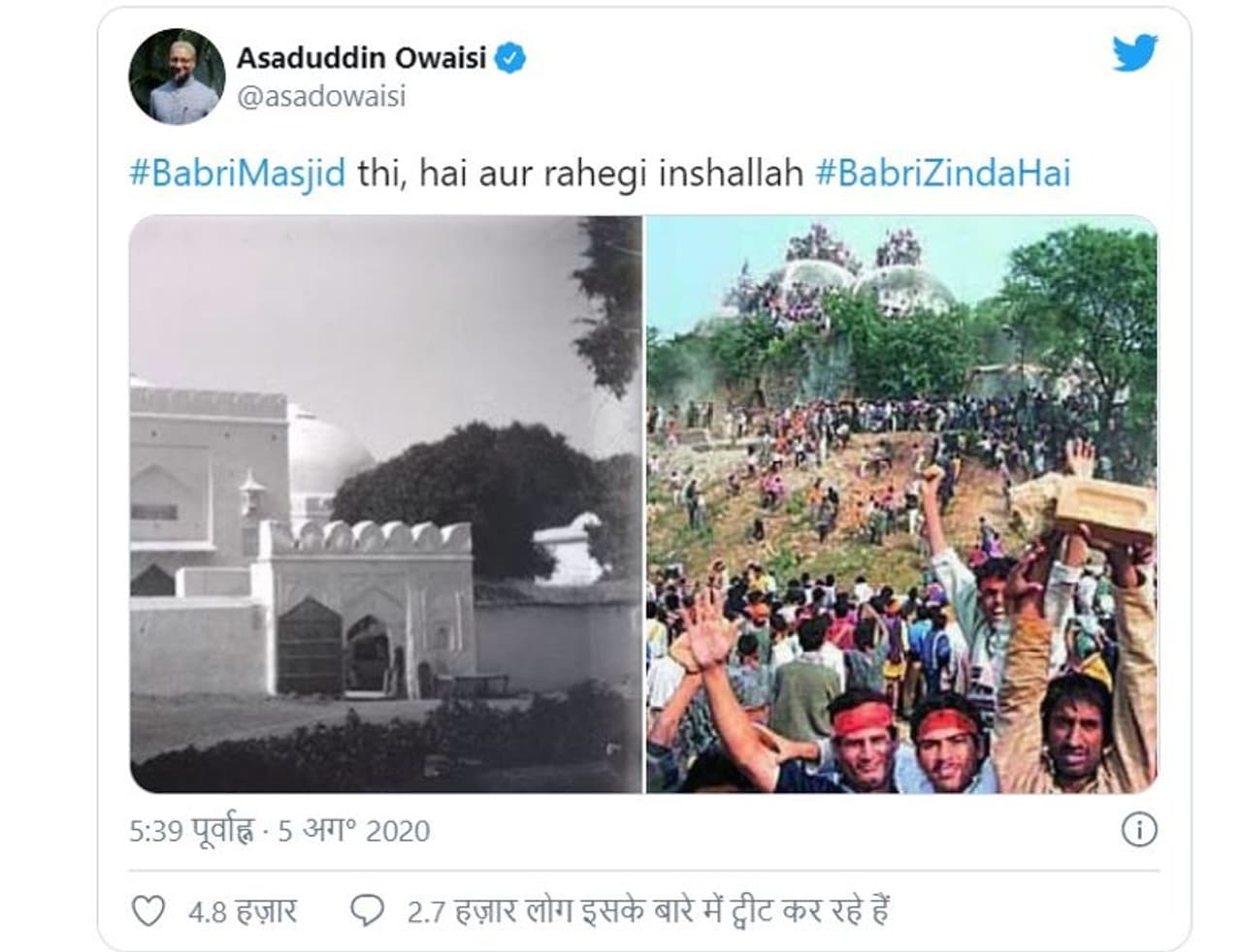 ऑल इंडिया मजलिस ए इत्तेहादुल मुस्लिमीन के प्रमुख असदुद्दीन ओवैसी ने भी सुबह 5.39 बजे ट्वीट किया है, जिसमें लिखा है ''बाबरी मस्जिद थी और रहेगी. इशांअल्लाह.''।