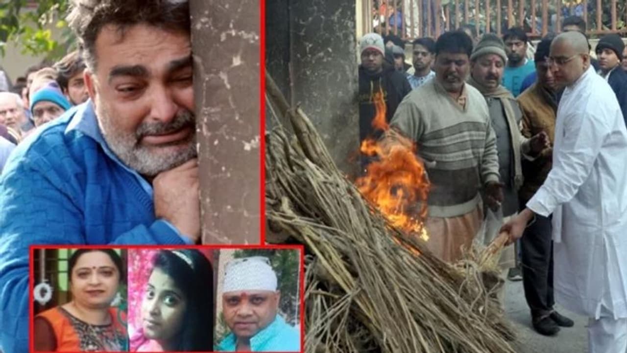 शामली (Uttar Pradesh). यूपी के शामली में जब भजन गायक, उनकी पत्नी और बेटी की शव यात्रा निकली तो सभी आंखे छलक उठी। एक साथ उठी तीन अर्थियां देख परिजनों के अलावा आसपड़ोस के लोग भी रो दिए। अर्थी को कंधा देने के लिए भी लोगों की भीड़ उमड़ी थी। बता दें, एक जनवरी यानी बुधवार को तड़के करीब 4 बजे भजन गायक अजय पाठक, पत्नी स्नेहा, बेटी वसुंधरा और बेटे भागवत की हत्या कर दी गई थी।