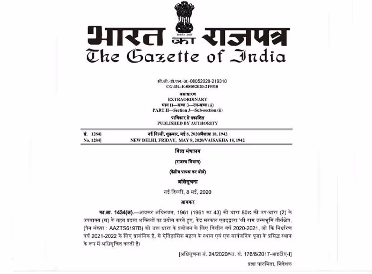 अयोध्या में राम मंदिर के निर्माण के लिए बनाए गए श्रीराम जन्मभूमि तीर्थ क्षेत्र ट्रस्ट में दान करने इनकम टैक्स नही लगेगा। इसको लेकर केन्द्रीय वित्त मंत्रालय ने इसको लेकर नोटीफिकेशन जारी कर दिया है